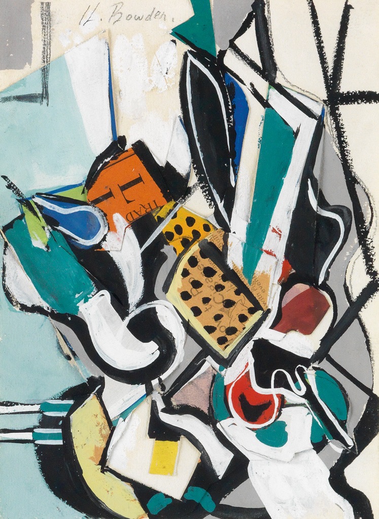 Harry Bowden, untitled still life, mixed media, gouache and collage on paper, 8″ x 5 3/4″, c. 1937. Collection of Martin Diamond Fine Art.