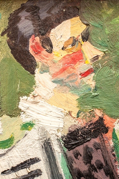 It’s worth noting that the canvas lacks any of the simplistic qualities of social realism or the stylization of art deco and mural work. But the subject matter, depicting a man engaged in recreation or entertainment, epitomizes the beauty of WPA work – that it can elevate seemingly unworthy people and events into legitimate subjects for works of art. The departure from portraits of aristocrats, church paintings or staid landscapes to depictions of the common man or worker is a pivotal moment in art history. Here Bowden does it fusing both WPA and Abstract Expressionist styles. He manages to paint both these histories in the same canvas because he infuses the figure with smaller abstract canvases into that single figure, in effect, meshing together these two movements. By doing so he projects the figure into motion and helps the viewer imagine the accordion’s sound.