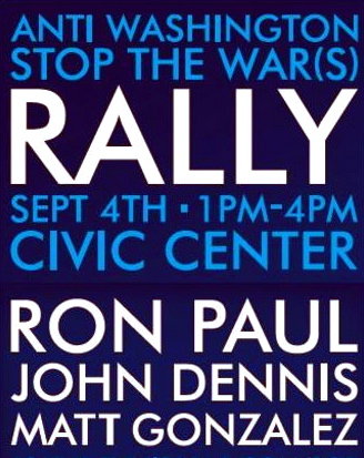 Poster advertising political rally at San Francisco’s Civic Center plaza featuring Congressman Ron Paul, John Dennis, and Matt Gonzalez, September 4, 2010.