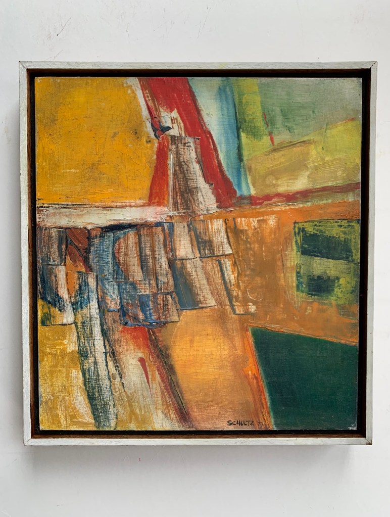 Schultz first showed in New York City at Gene Monahan’s Studio Gallery on 13th Street in Greenwich Village in November of 1959 (a solo show arranged by Schultz’s Colorado mentor, the painter Charles Bunnell), and later at the various 10th Street co-op galleries, including the Brata and Phoenix galleries.