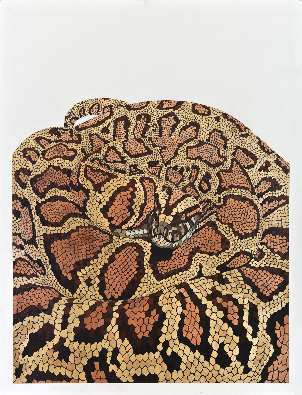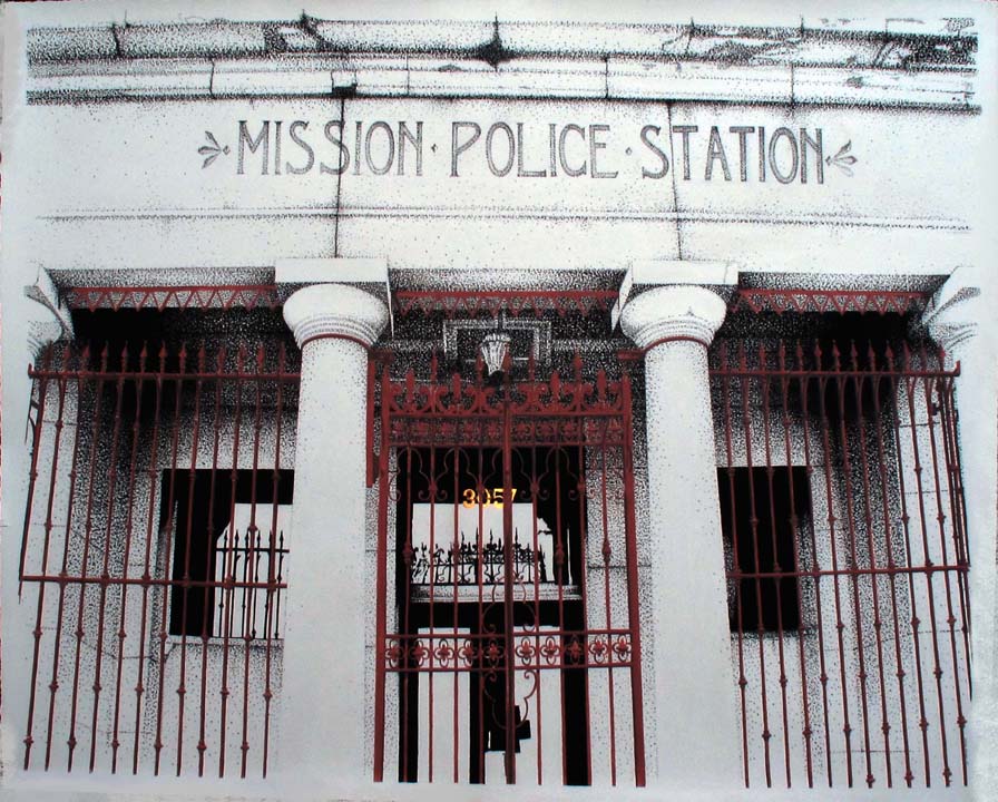 In addition to rendering patterns and creatures that inhabit nature, such as snakes, ants, and bees, Franzese has also tackled local architecture before it is renovated or otherwise disappears. A building such as the historic Mission Police Station becomes a subject, in part, because of the evanescence of the lifespan. Franzese captures that presence while he can, and although ostensibly run-down, conveys its majesty.