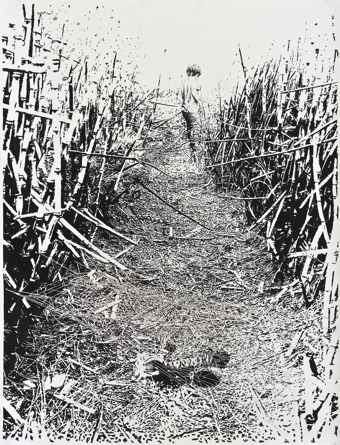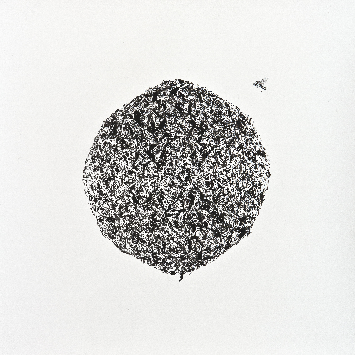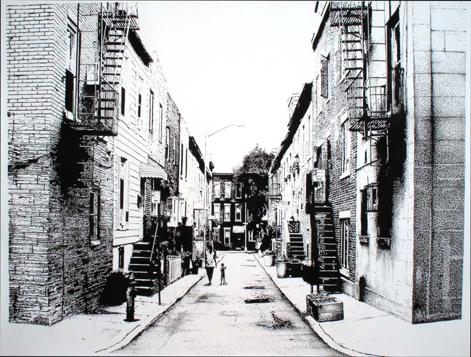 Fifteen years ago he began working with oil, adding mastic varnish to make the natural color richer. In the last two years, after other experimentation, he has moved to acrylic, utilizing a fine 9 brush for this dry brush technique. What started as a way to obtain the effect of etching and printmaking, particularly the shading, led Franzese to began painting with a flat latex black on white surfaces to approximate the look and feel of aquatint or graphite on paper. Eschewing the use of white, Franzese relies on the paper color to contrast with the black paint. The resulting painting resembles ink on paper, like an engraving technique, an aquatint. But it’s not graphite — it’s all acrylic.