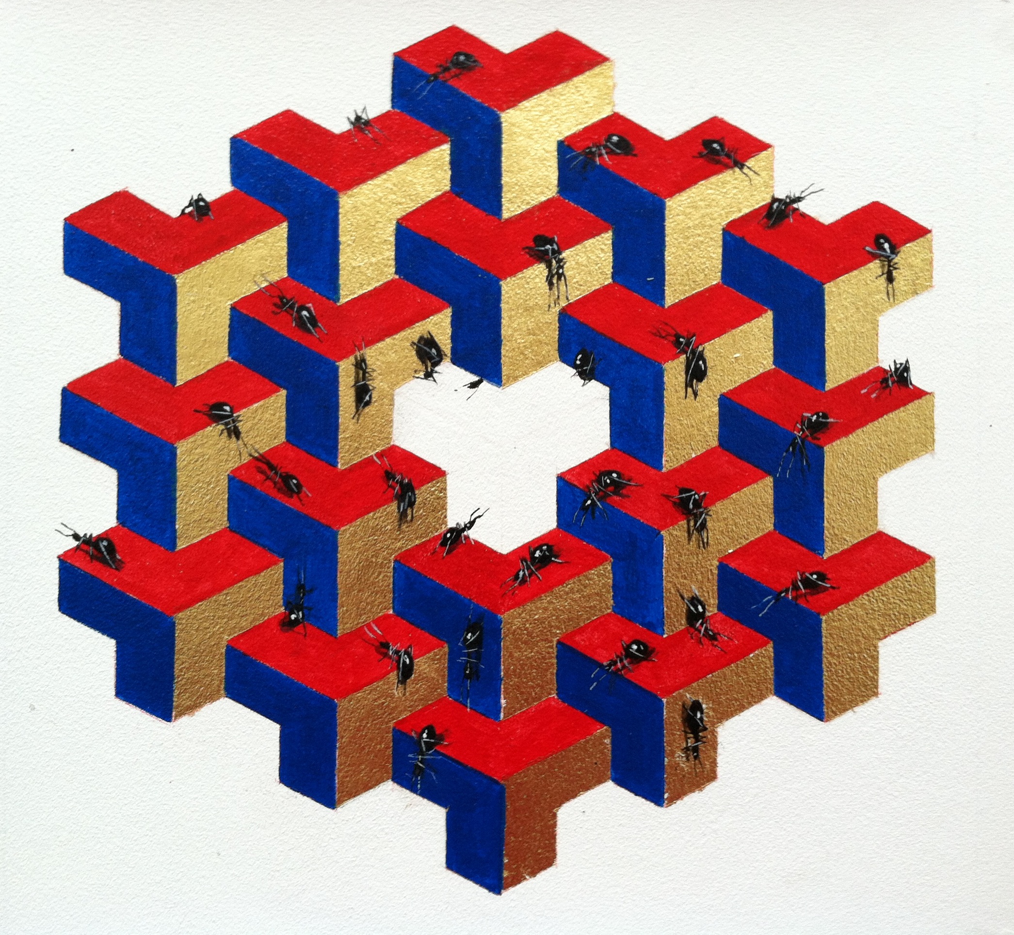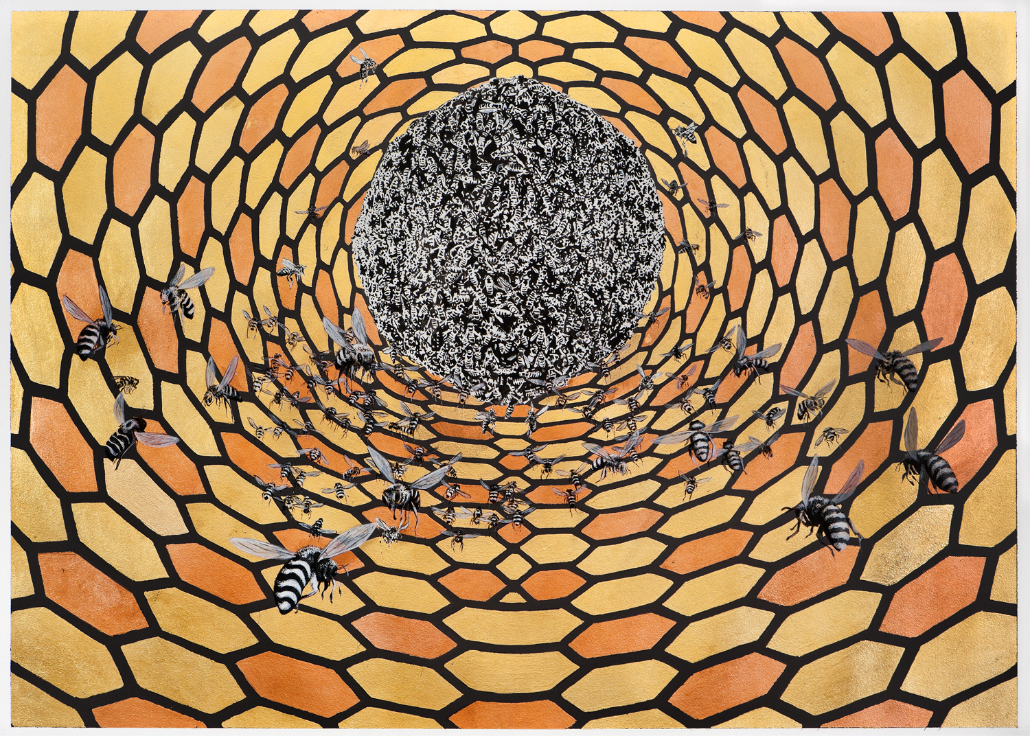 With the works that render geometric patterns, Franzese carefully paints images with insects calculated to fit dimensions like a puzzle. He draws from different palates of colors, then gold, white gold, silver, bronze, or copper are applied to fit into sections of a geometric shape. Once the geometric backdrop is laid out, insects are painted on to create the desired three-dimensional effect that plays with the viewer’s perspective.