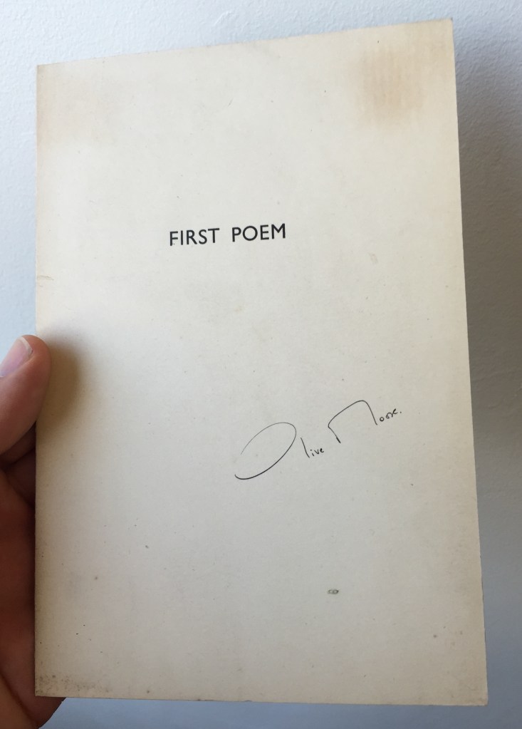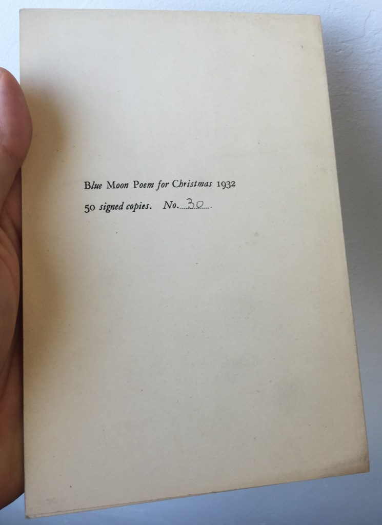 Olive Moore’s signature on the cover of First Poem / Statement published by Blue Moon Press as a “Poem for Christmas 1932”.