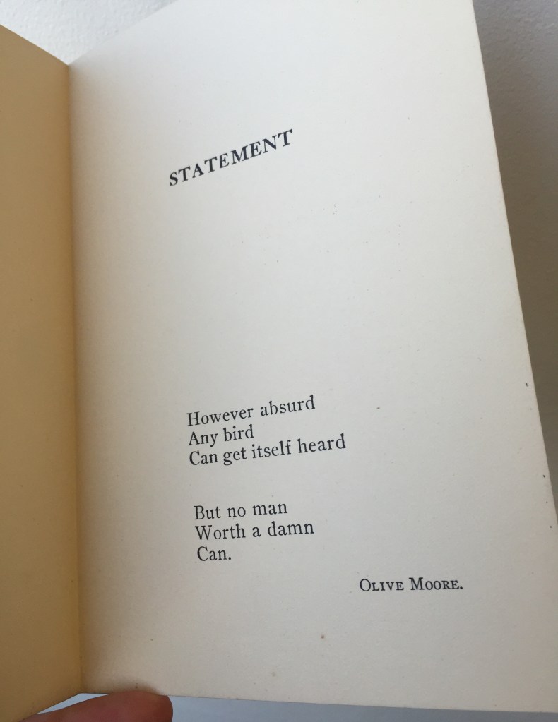 The idiosyncratic minuscule handwriting is unmistakably Olive Moore’s. It matches the signature found on the 6-line First Poem / Statement broadside (single-sheet, folded once) which was published as a “Poem for Christmas 1932”, in an edition of 50 signed copies. It also matches her signature in Further Reflections on the Death of a Porcupine and in Fugue (see photos below).