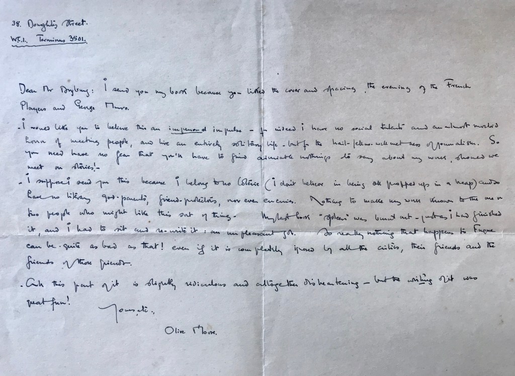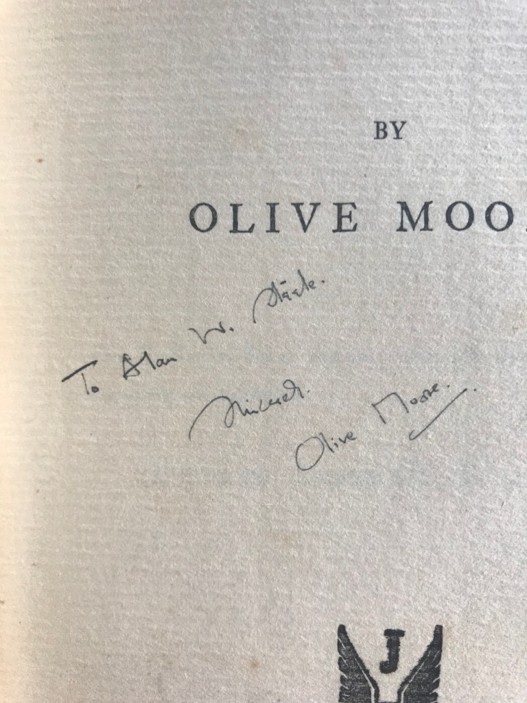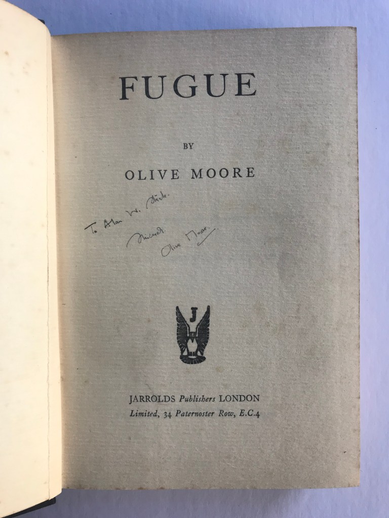 Olive Moore’s handwriting in Fugue published by Jerrolds Publishers in 1932, inscribed to Alan Steele, a publisher and editor who also frequented Charles Lahr’s Progressive Bookshop in London.