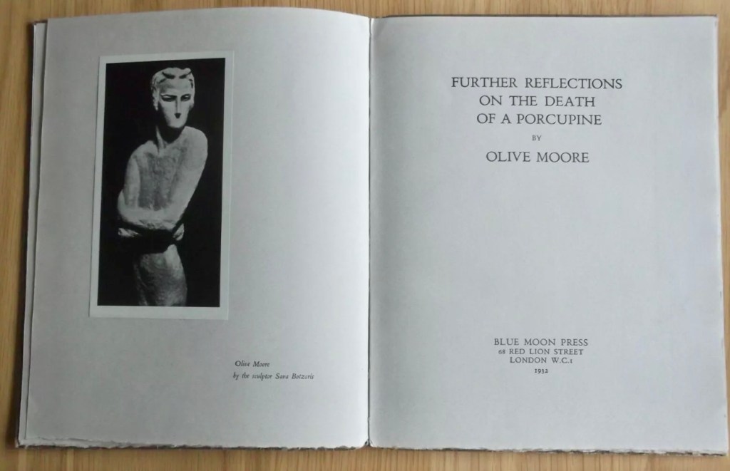 Olive Moore’s signature in Further Reflections on the Death of a Porcupine published by Blue Moon Press in 1932.