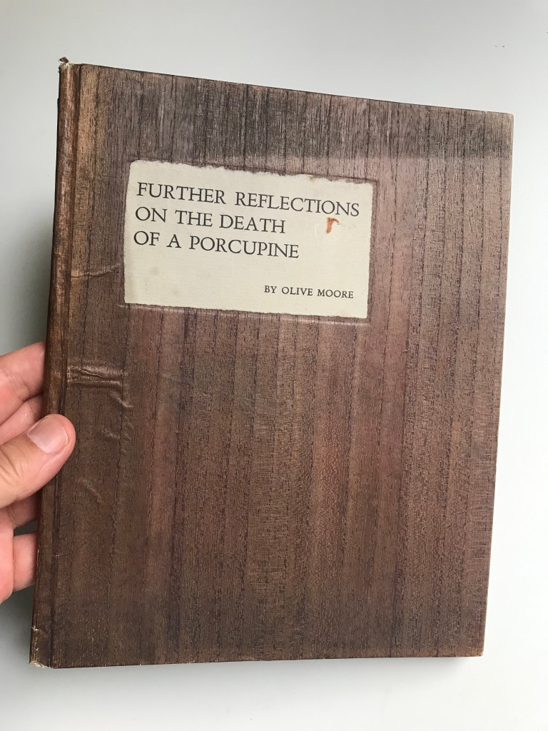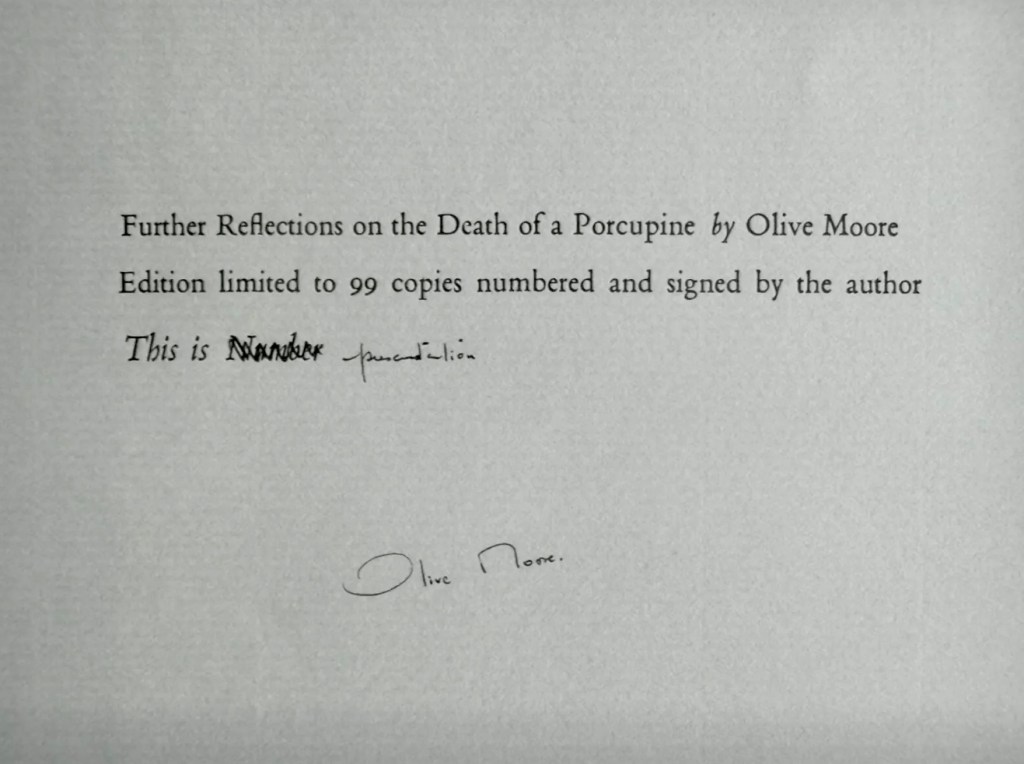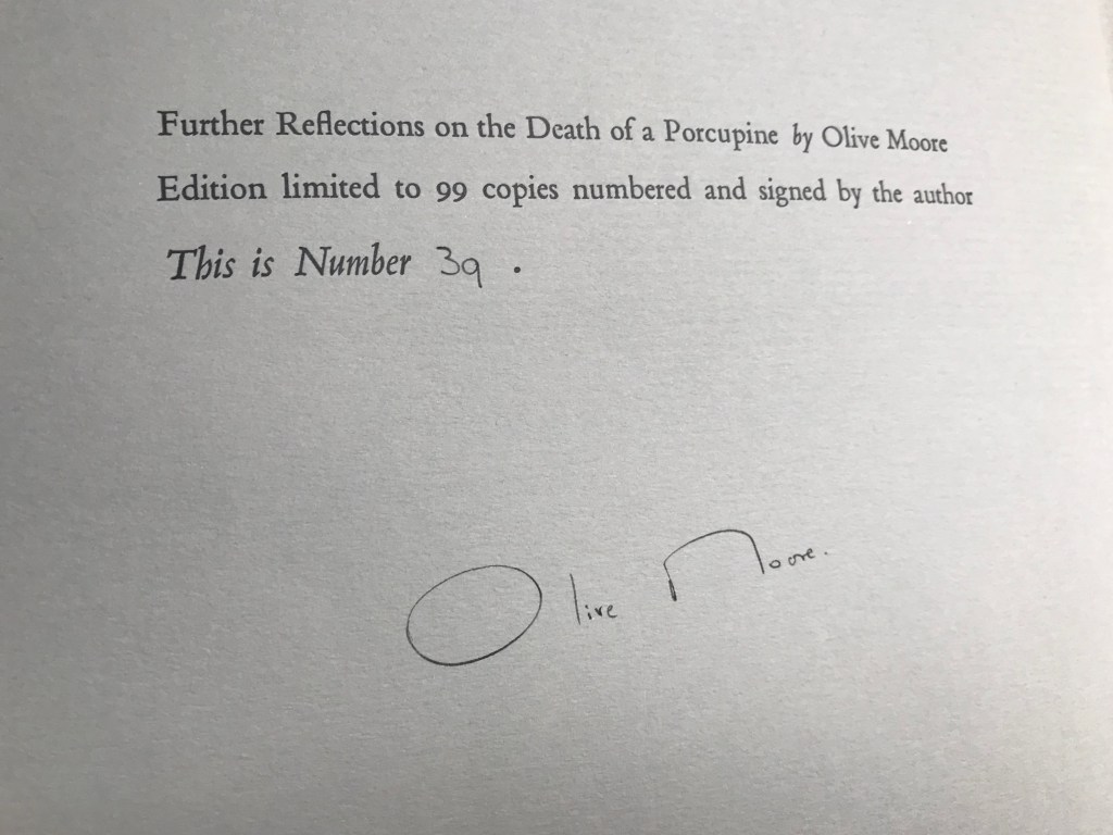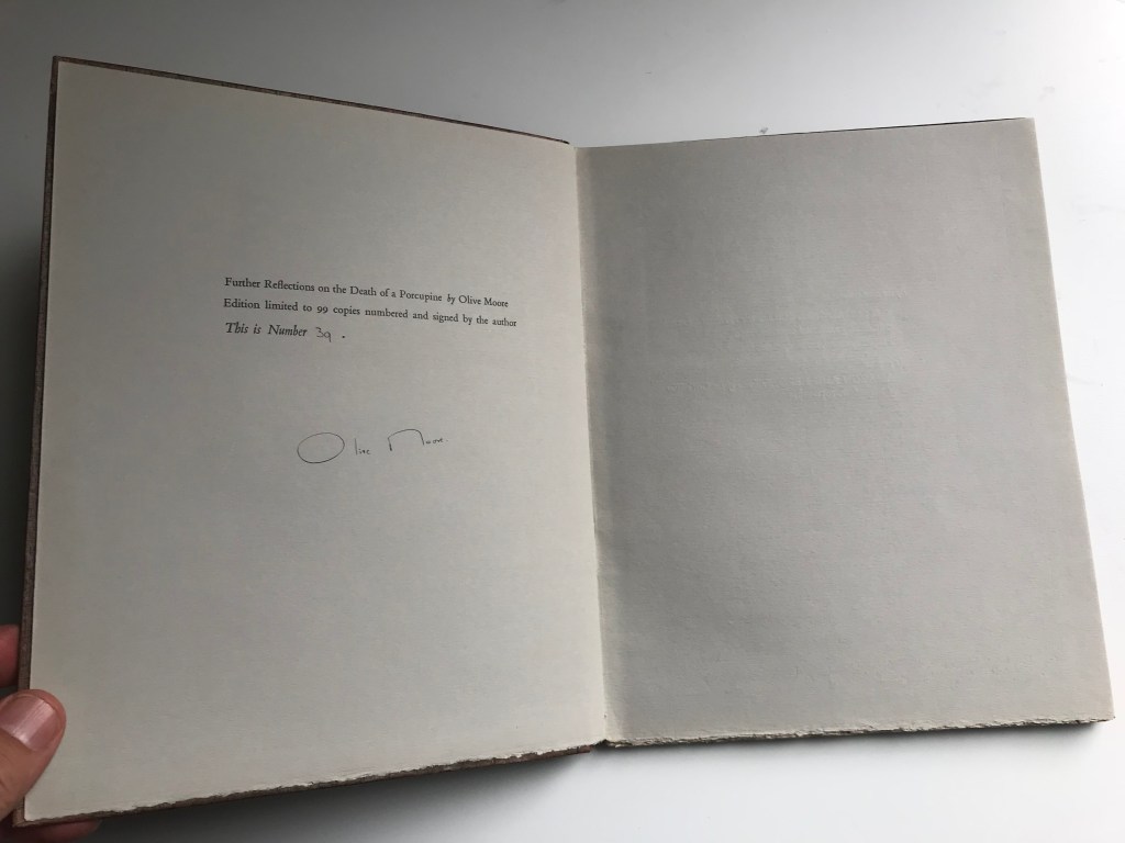 Another example of Olive Moore’s handwriting in a copy of Further Reflections on the Death of a Porcupine published by Blue Moon Press in 1932. Moore has noted this is a presentation copy, existing outside of the 99 numbered edition.