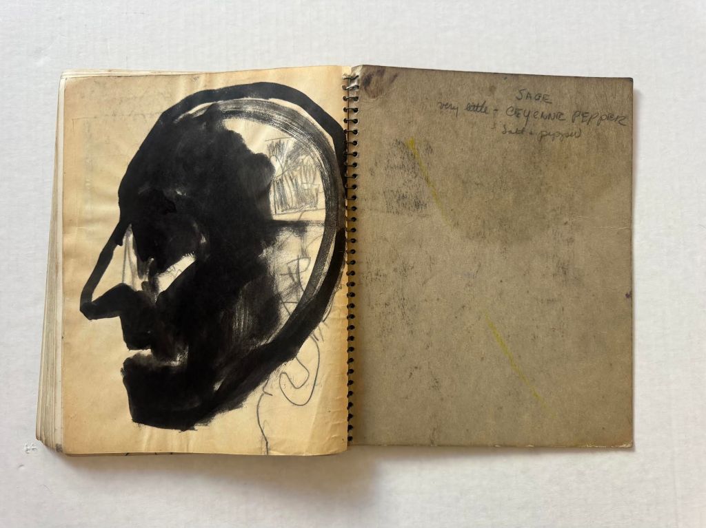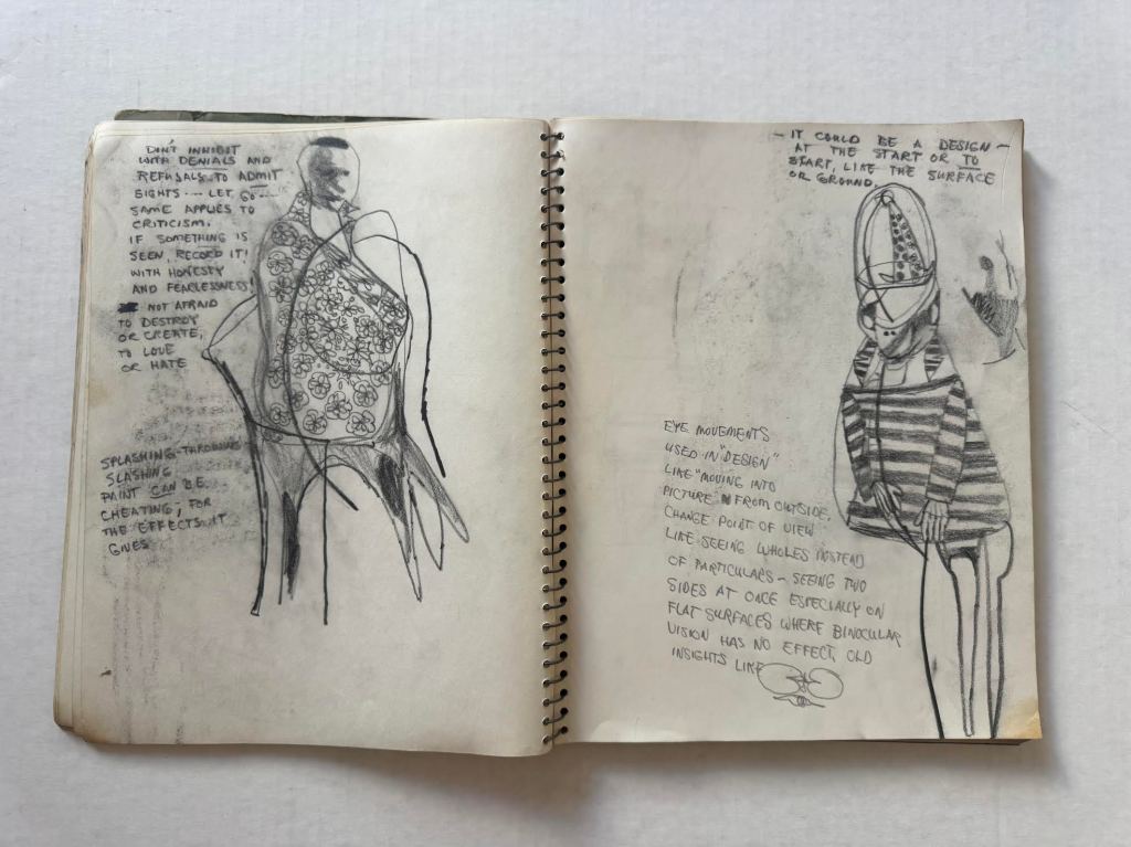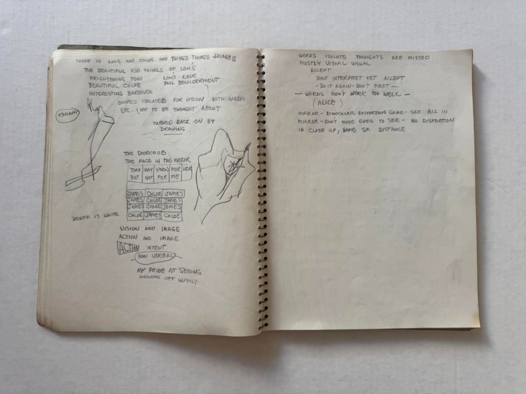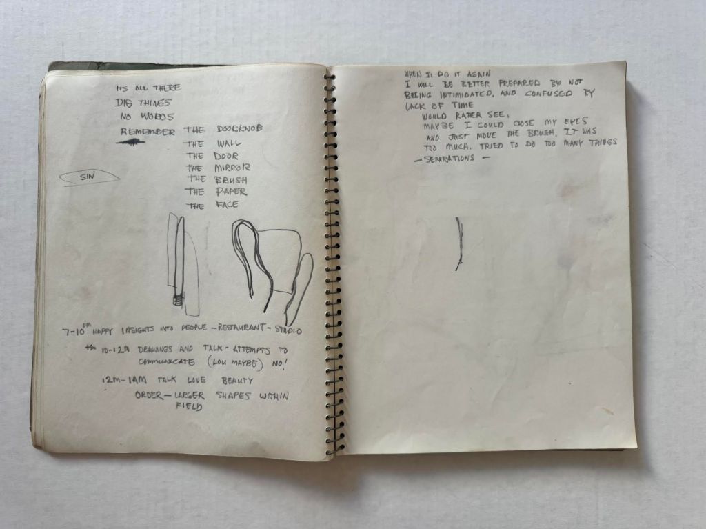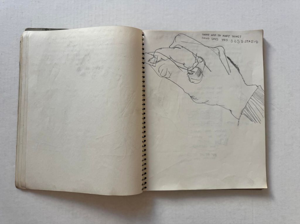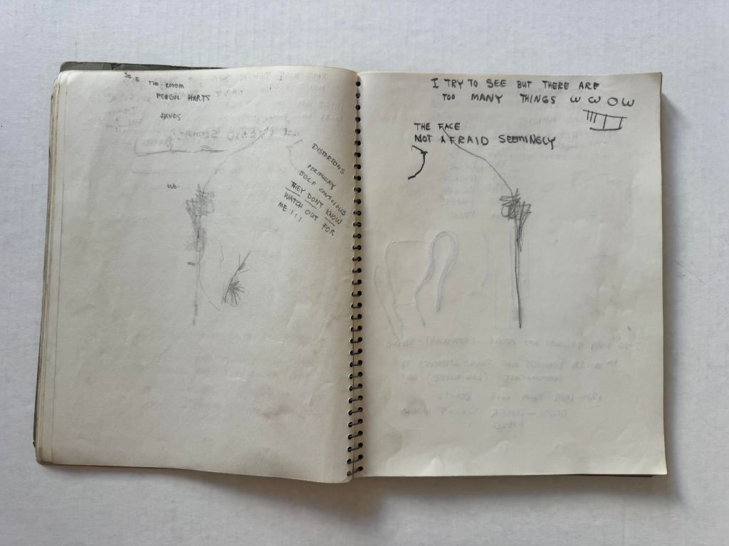 Relevant pages from Jim Muhs’ late 1950s notebook which includes notes during an LSD experiment. Private collection, Southern California.