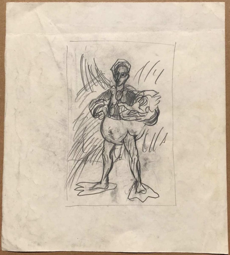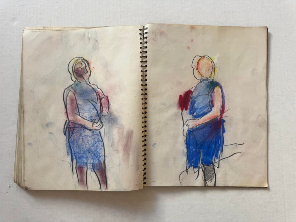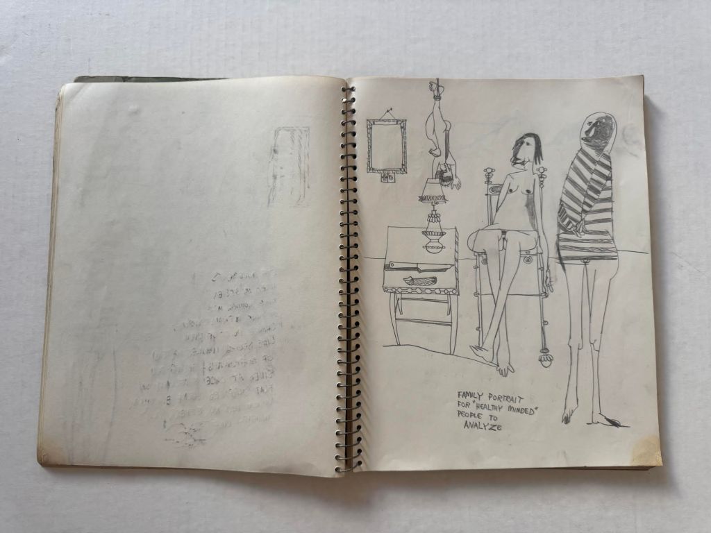 David Keaton, an art dealer based in Sonoma, California, who has also curated many exhibitions of post-World War II artists, first identified the notebook that came from Mel Hanson’s estate (via his father Dr. Karl Hanson to art dealer David Carlson in the late 1990s) as possibly belonging to Firehaus member Jim Muhs. The notebook is filled with artwork that does not appear to be by Hanson, yet still matches the general representational aesthetic of the period.