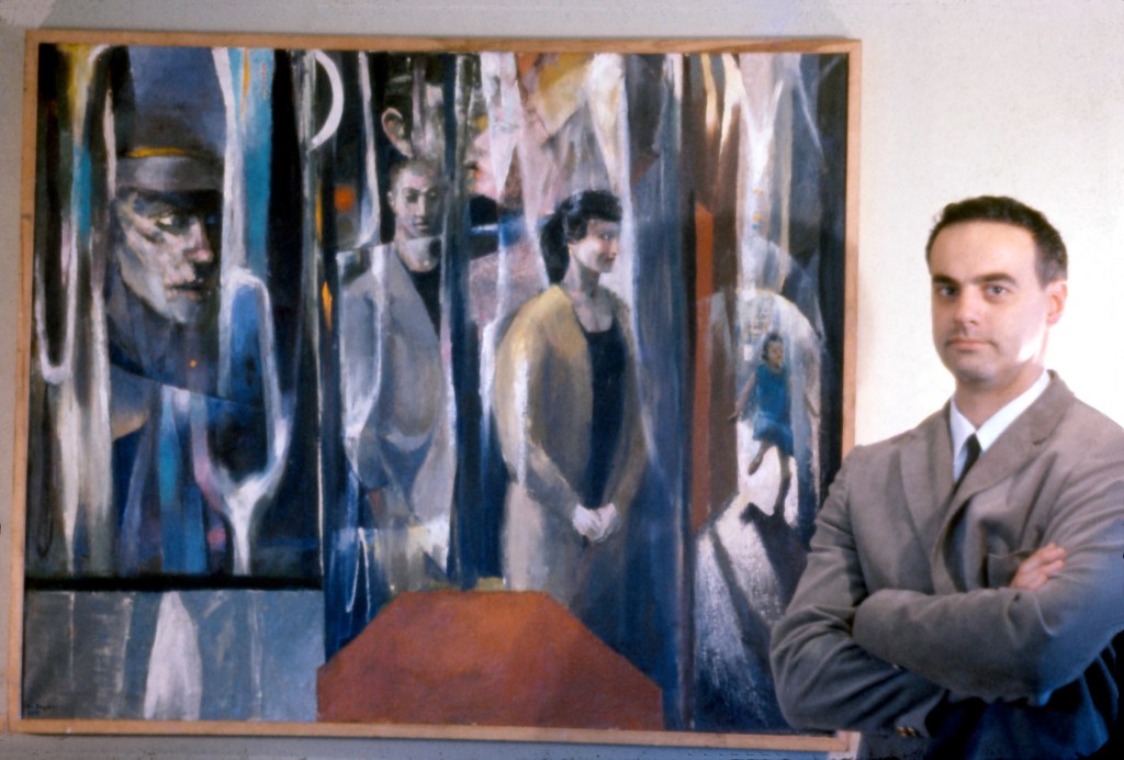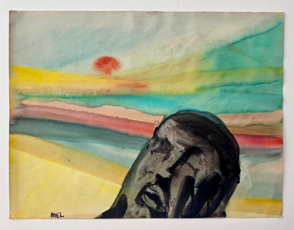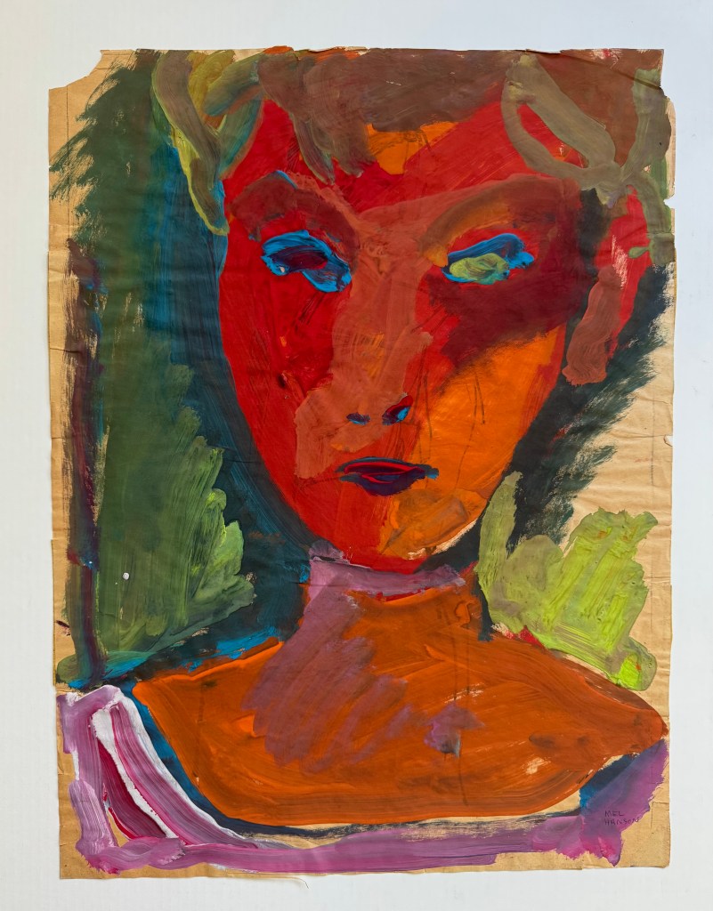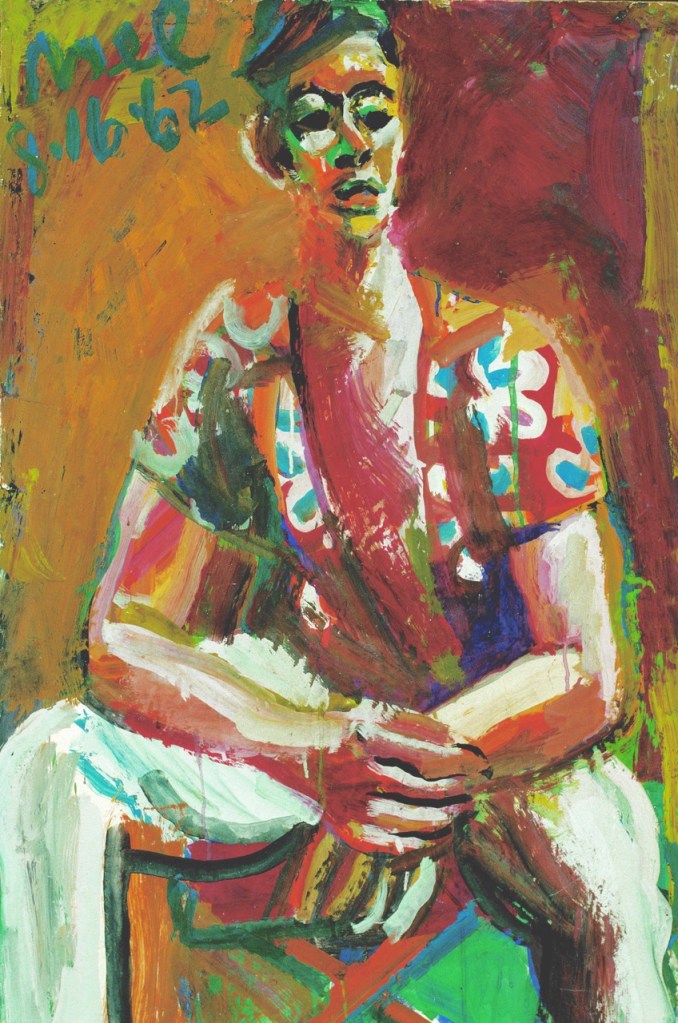 “But, as Belcher Studios Gallery demonstrates with their current exhibit, Mel Hanson: Retrospective 1938-1962, he did leave behind an impressive body of work. The exhibit — including portraits, self-portraits, collages, assemblages, and studies — doesn’t just show the tragedy of a promising artistic career cut short, but also the incredible talent and wry social commentary of a young man who was passionately devoted to his work. Hanson was primarily a figurative artist, although he was also influenced by German Expressionism, Pop- and Funk-art. This eclecticism only helps to compliment the quirkiness of the artist.