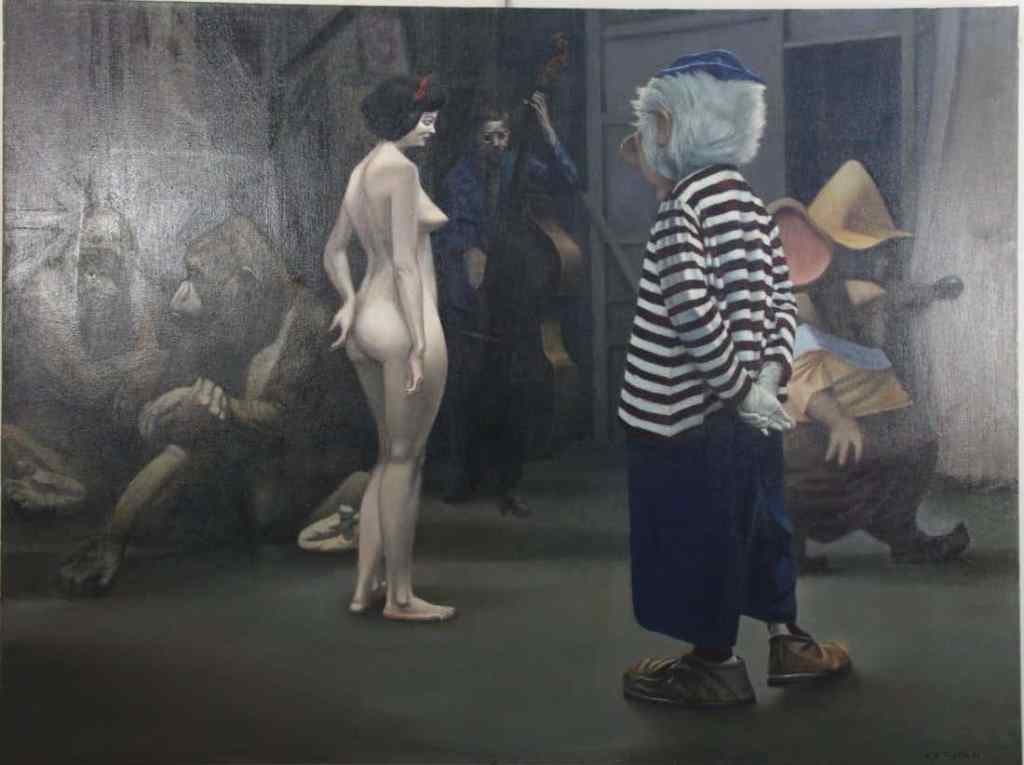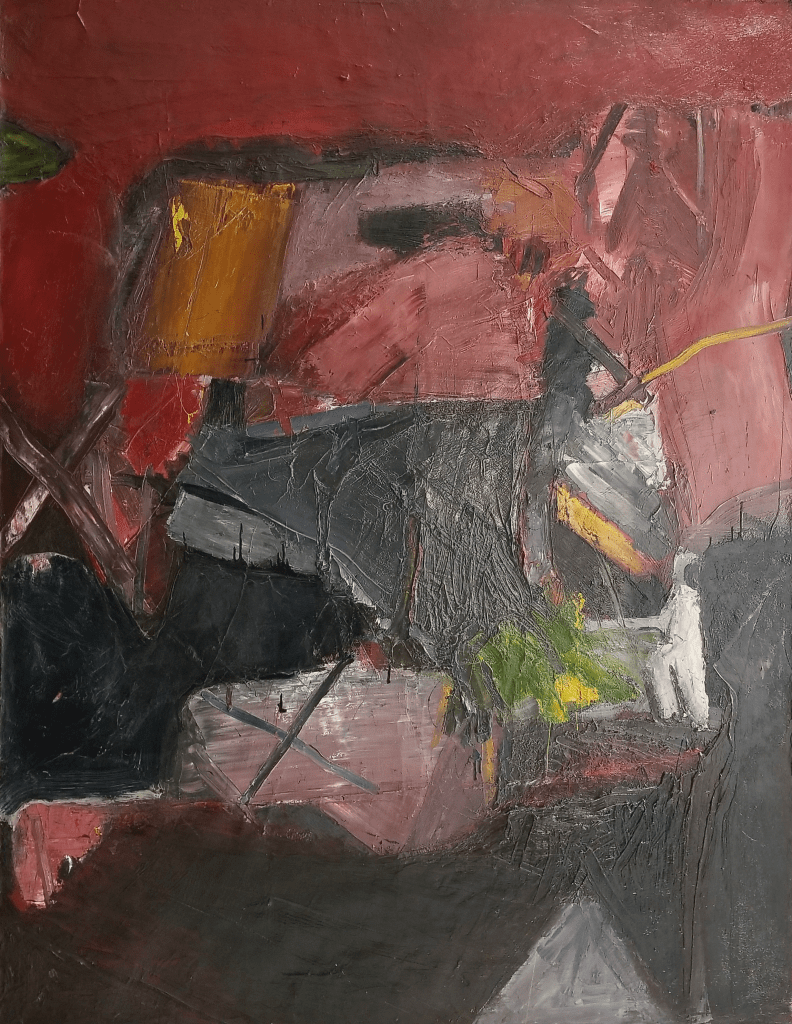 “The materials for most of us included Fuller Color in Oil. It came in quarts and gallons and was normally used to tint house paints, as they were pure color. They were very inexpensive, five dollars for a gallon of red. House painters’ brushes helped to cover canvases rapidly and large tubes of oil paint with artist bristle brushes were used for the more detailed parts of the painting. Large sticks of charcoal, black inks, colored pencils, carpenters pencils, large spatulas, and other materials and implements if needed were also employed.”