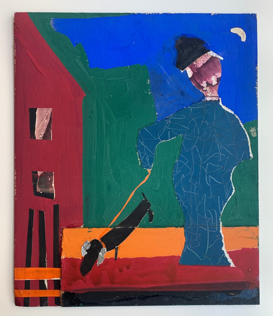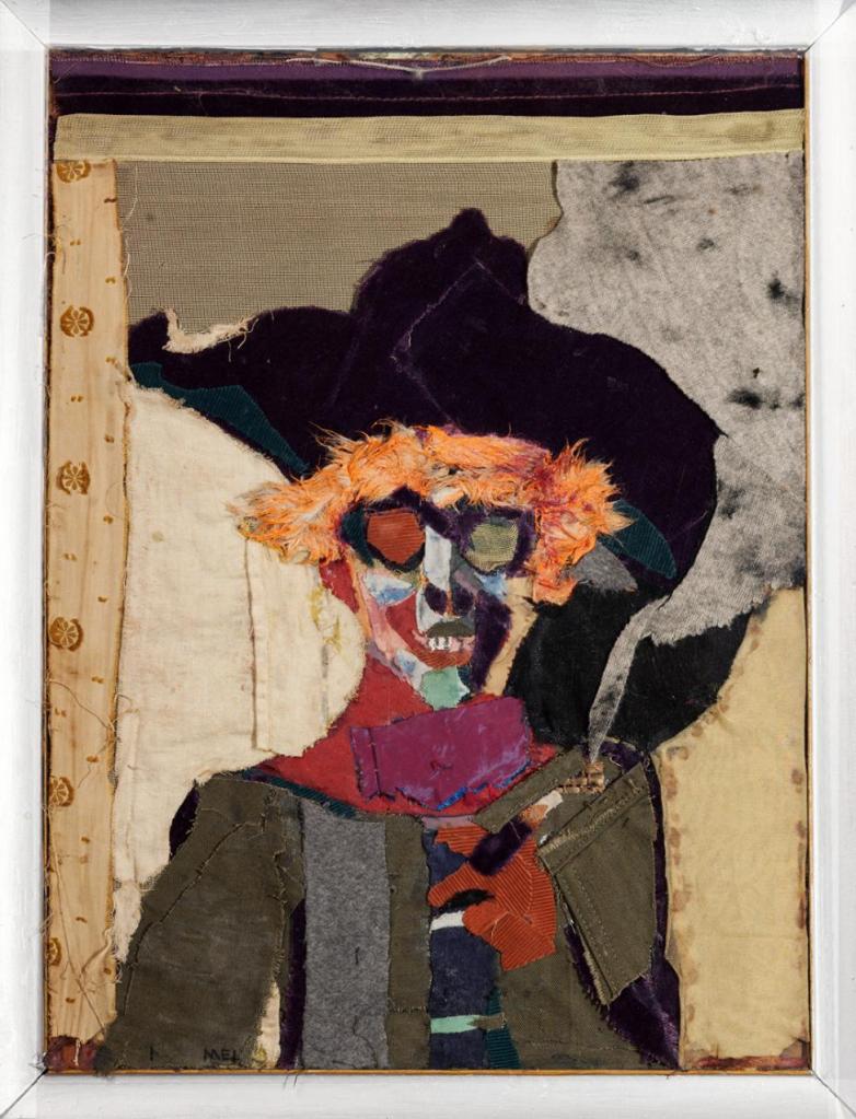 Cedric Wentworth: “Hanson’s interest in Pop Art can be seen in a dramatic self-portrait fabric collage made the year before his death. Self Portrait With Frankie Dewey’s Red Wig shows the artist smoking a cigarette and wearing a broad brimmed floppy felt hat. A bright red wig frames his sunglasses. The artist stares straight at us, the bony forms of his face giving him a frightening, otherworldly presence. The portrait is disconcerting, even menacing, as a sense of foreboding permeates the image.” Rubber Diamond Gallery.