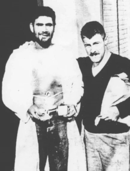“We had about one big blowout exhibition a year with many of Farley’s friends invited as well as stragglers. There was booze, music and entertainment. Billy Watson, a friend of [Bill] Snyder’s got in a fight with a defrocked Episcopalian priest who tried to hit on Billy. Farley topped the evening off, ending the show, by finding the toughest guy at the gathering who was a judo expert. He mopped up the floor with Farley who was thrown repeatedly over his shoulder to the floor. The cops came at about that time, with most of us going to the Stockton jail and released a few hours later. Farley was in good shape after the thrashing.”