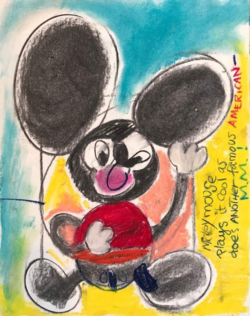 “Hanson’s portraits and cartoon studies, while often whimsical, also mask darker social commentary and astute political observations. Images of death seem almost prophetically to be lurking about his self-portraits, and his use of Disney characters, particularly his obsession with Donald Duck, are both violent and ominous. One of his seminal works “The Temptation of St. Walt Disney,” captures his ambivalence toward the cartoon patriarch and the grotesque social fantasies behind his characters’ violent and anarchistic behavior. The beloved Disney icons are portrayed as dark shadows posed in threatening and openly hostile behavior toward their imperiled creator.