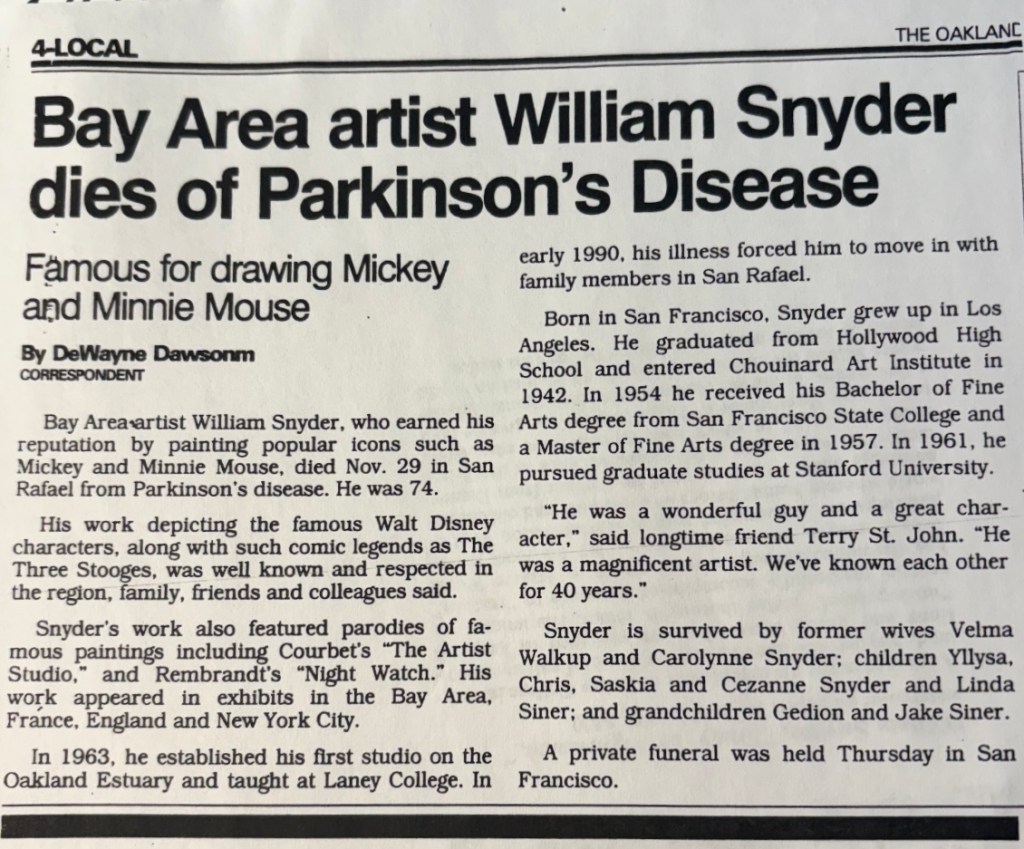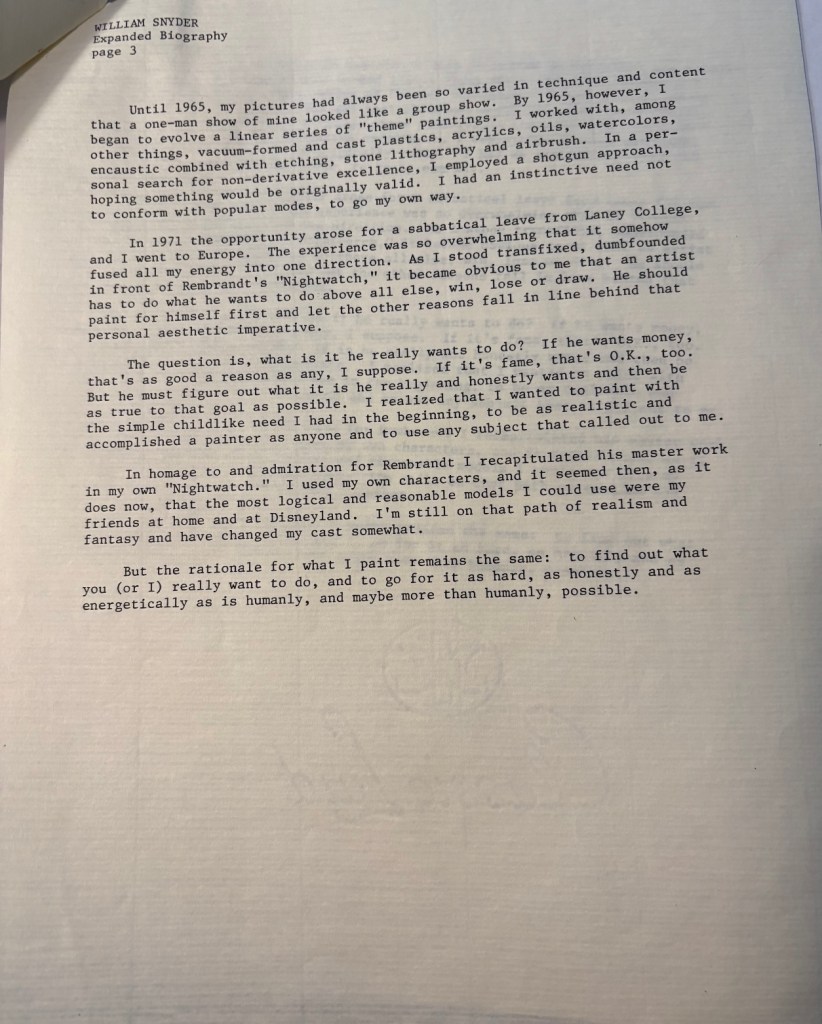 38 — William Snyder is further mentioned in Albright’s “Personal Mythologies” chapter: “The paintings of Franklin Williams and Olive Ayhens, like those of De Forest, drew images and design elements from sources in primitive art – and these were given an extra cachet in Williams work by the addition of spidery tufts of thread. William Snyder brought together anonymous figures in Disneyland costume with images of his friends and family in big paintings that were often parodies of old masterpieces – Rembrandt’s “The Nightwatch” and Courbet’s “The Artist in His Studio.” p. 248.
