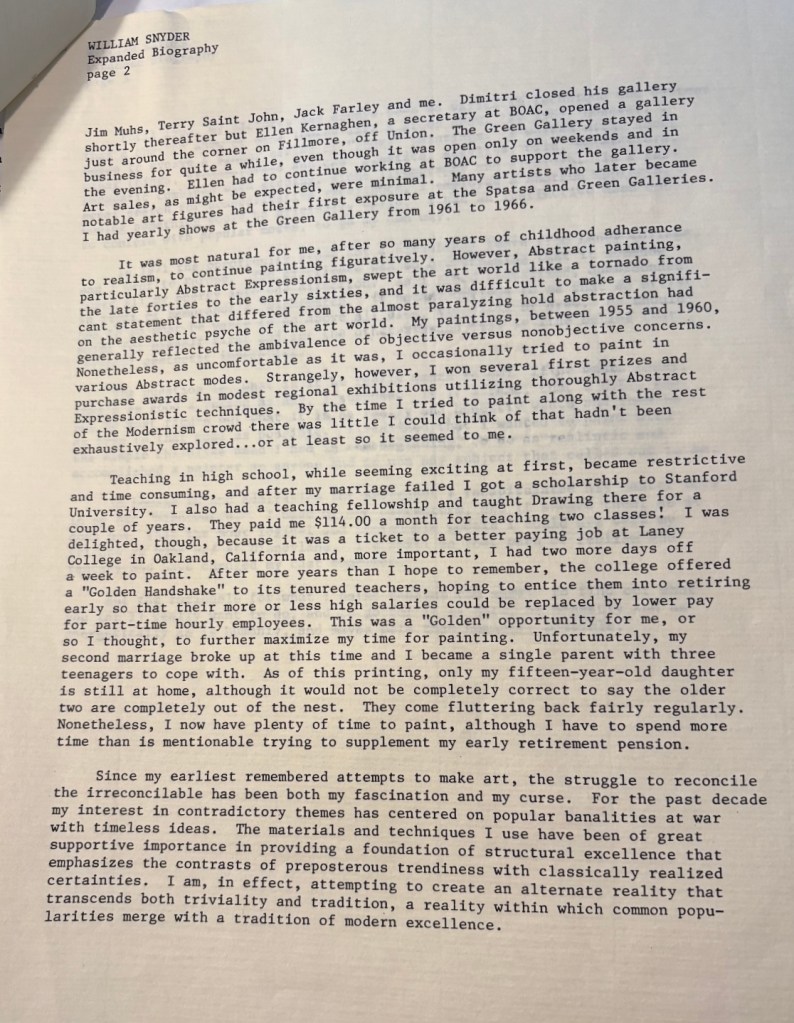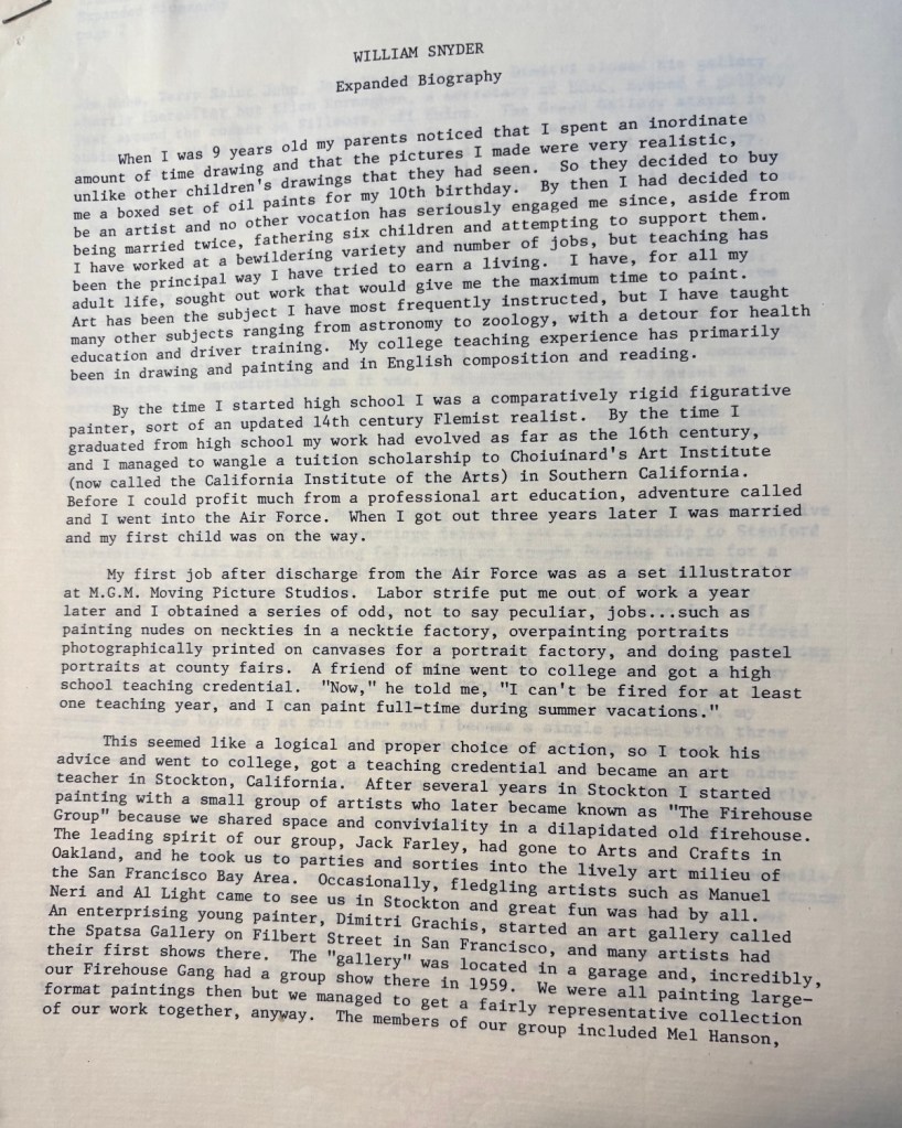 William Snyder (1926-2000) was born in San Francisco on September 26, 1926. He attended Chouinard Art Institute in Los Angeles in 1942-43, before serving in the U.S. Air Force for three years. He obtained both a B.A. and M.A. from San Francisco State College in 1954 and 1957; and studied at Stanford University in 1961-63 (where he also taught drawing). Snyder worked as an art instructor in the Stockton Public Schools from 1955-61 and taught in the art department at Laney College in Oakland from 1964-84. In 1994, he was a recipient of a Pollack/Krasner Foundation grant. He died in San Rafael, CA on November 29, 2000. [fn14]