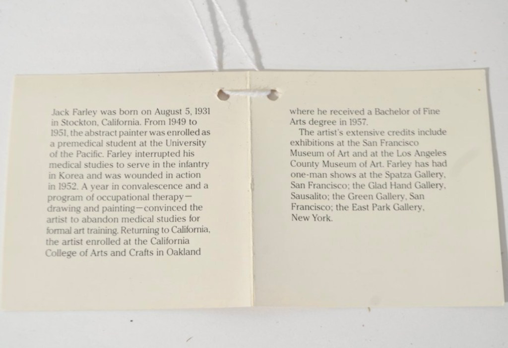 Jack Farley (1931-2021) was born in Stockton on August 5, 1931, of Spanish-Portuguese ancestry on his mother’s side. He graduated from Stockton High School in 1949, where he excelled in athletics, particularly basketball. From 1949 to 1951 he was enrolled as a premed student at College of the Pacific (now University of the Pacific) and also attended Modesto Junior College for one year. His studies were interrupted when he served in the U.S. Army infantry during the Korean War, where he was wounded in action in 1952. He was thereafter in convalescence and a program of occupational therapy for a year. Returning to California, he obtained a B.A. in 1957 from the California College of Arts and Crafts (CCAC) (now the California College of the Arts) in Oakland. When he returned to Stockton he took some classes at the College of the Pacific. After the Firehaus days he moved to Southern California where he had success working as a designer and artist for movie and television studios in Los Angeles. At the time of his death, on June 20, 2021, Farley lived in Poulsbo, WA, northwest of Seattle. [fn8]