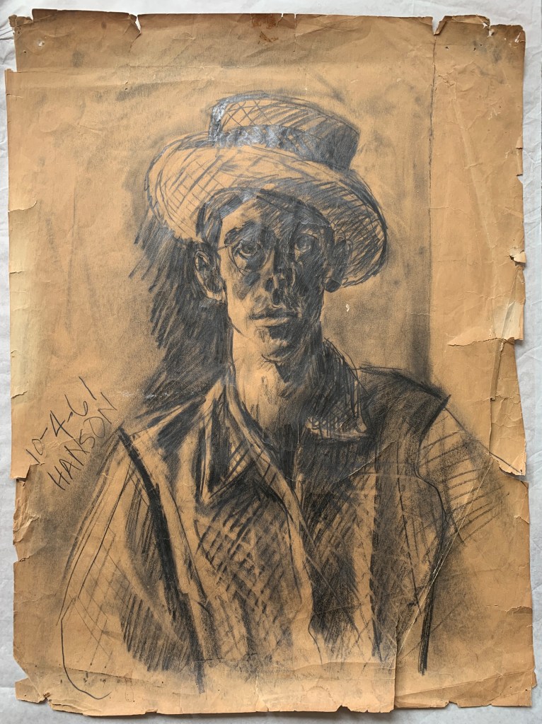 Jack Farley remembers that Hanson “was an experimental kid. He was willing to try out new things. He had an open mind.” This is manifested in the constructions and assemblage work he did. St. John concurs: “Hanson did assemblage/sculptures that were masterpieces. St. Sebastian riddled with arrows and flowing blood.” Farley lavishes praise on Hanson saying “he was very talented, and was really good with assemblages.” “He made really good paintings,” and simply, “he was a good kid.”