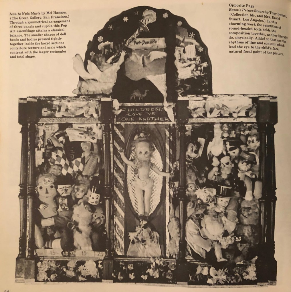 MELVIN HANSON, Green Gallery: This small gallery has devoted three successive exhibitions to a memorial retrospective of works by the late Melvin Hanson. It is clear that the automobile collision which claimed Mr. Hanson’s life in 1962, at the age of 24, deprived the Bay Area of a promising artist in his formative years. The quotations from his writings in the gallery brochure as well as the exhibited work, reveal not only a youthful exuberance but a mystical viewpoint, reminiscent of William Blake’s, encompassing in its contemplations the demonic, the Dionysian, and the naively beatific. Currently exhibited is a series of charcoal and pastel drawings for a contemplated painting: The Temptation of St. Walt Disney. These drawings are charged with tense drama and movement and conjure an imagery partly derived from Disney’s cartoons and partly from Hanson’s imagination, and give the impression of a “translation” of Bosch and Gruenwald into a strange idiom containing elements of Pop Art vernacular. While it is clear from these and other drawings such as “Study for a Portrait of Eric von Stroheim,” that Hanson was slowly and successfully grappling with problems of technique pertinent to his personal viewpoint, the work suffers a lack of some of the facility and resources to which formal training, if not a sine qua non, is at least a short-cut. The first phase of this three-part exhibition featured assemblages, of which “Icon to Nyla Marie” was the most evocative: a whimsical cluster of dolls and cut-outs in the “Byzantine Rococo” manner of a panel from a 91th-century Russian Othodox “Ikonostas.” P.D.F.
