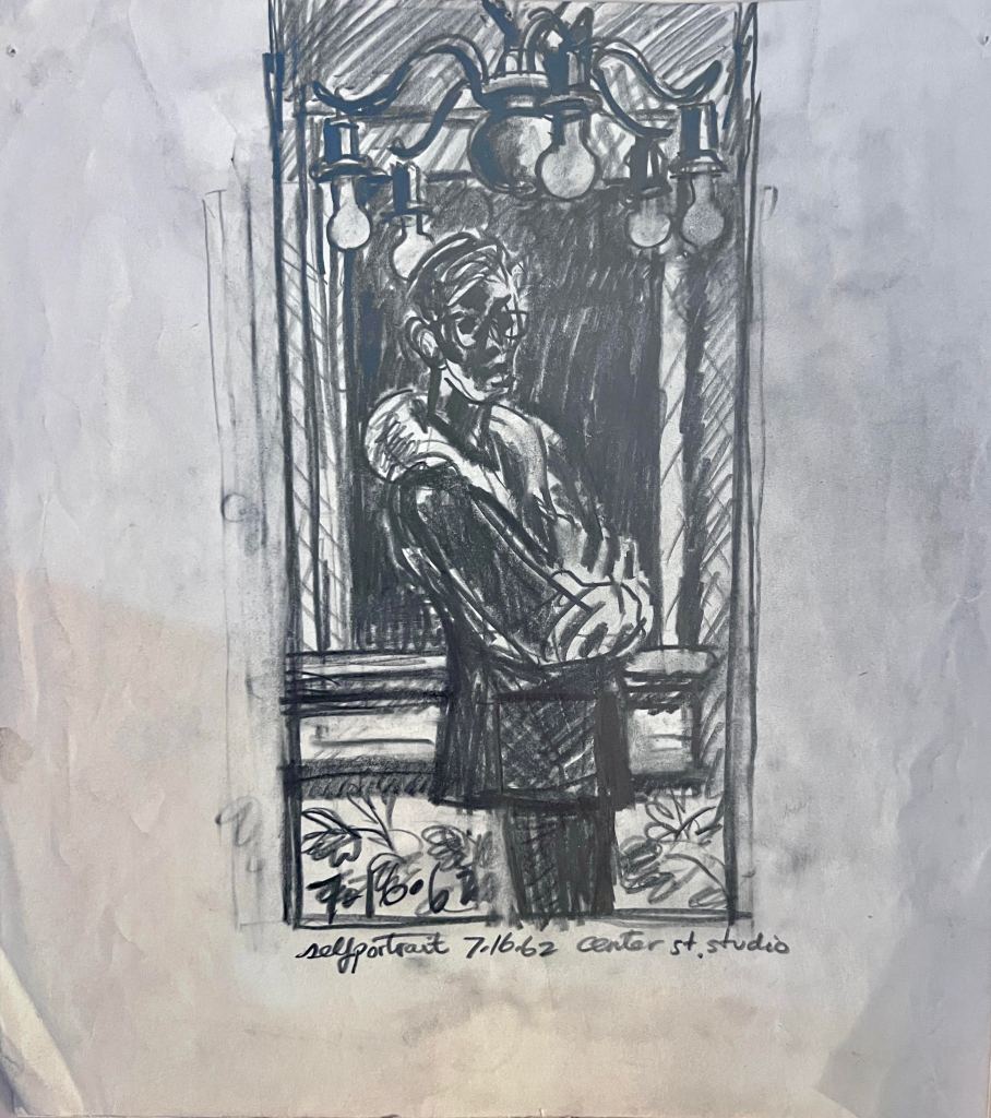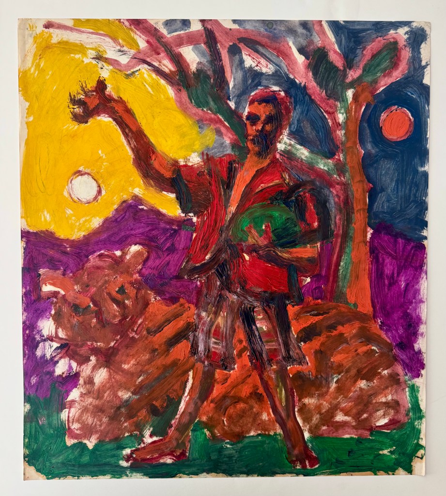 35 — There are many other stories of the Firehaus Group. In one, St. John remembers that some members of the Firehaus group served as extras in a local play, or what St. John calls “walk on actors.” The play was performed at College of the Pacific or a Jr. College in the area and St. John recalls it was “possibly by Brecht”. With the passage of nearly 60 years it’s difficult to recall details, but St. John remembers that it was a “legitimate theater, a nice stage, before a large audience”. He specifically recalls the play was “definitely German Expressionist” and that “I recall a burial scene” in it [making it possibly Bertolt Brecht’s Mother Courage and Her Children which includes a scene of Catholic General Tilly’s funeral]. St. John remembers that the director, Bill [last name unknown] was an English professor and actor, who later posed for St. John wearing a priest’s habit. St. John says “I have a tempera drawing of him much in the vein of the drawing that I made of Mel.”