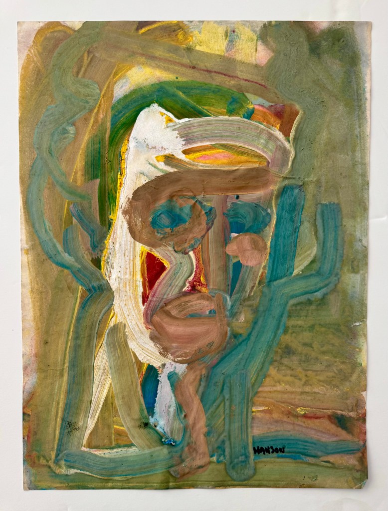 Three posthumous shows have been confirmed with newspaper announcements and a review. The Green Gallery show which was three consecutive memorial exhibitions of Hanson’s work included 1-Paintings and Assemblages; 2-Portraits, Self Portraits, and Figures; 3-The Temptation of St. Walt Disney. During the show it was promoted in the newspaper as “Paintings and Other Works”. January 26, 1964. However, this promotion was not for a separate show as a review of the three consecutive shows was published February 16, 1964. It also served as a notice the shows were concluding.