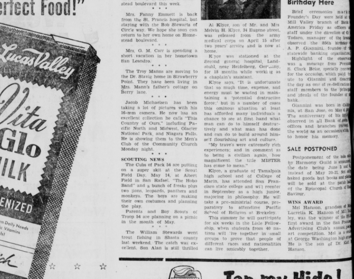 Hanson’s father, Dr. Karl Hanson was a psychiatrist working in San Francisco who taught psychiatry and was associated with Langley Porter Clinic. Dr. Hanson grew up in Mill Valley and was a graduate of College of the Pacific which may explain why the younger Hanson attended. [fn24] His mother, Margaret Jessup Hanson, who was born in Martinez, was a progressive activist in the Bay Area, connected to the First Unitarian Church and a member of the Interfaith Peace Committee in San Francisco. She was an early supporter of racial equality and gay rights and also worked in support of the farm labor movement. It is likely Mel Hanson was raised in a very progressive household. [fn25]