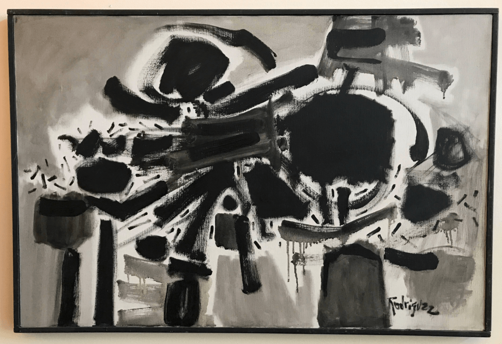 Peter Rodriguez (1926-2016) was one of fourteen children born of Mexican parents in Stockton on June 25, 1926. He received early recognition for figurative work, exhibiting at the Haggin Museum in Stockton in 1954 when he was 28. The exhibition was the reward for winning a local art prize. He was primarily an abstract painter during the Firehaus days. In addition to working in advertising and fashion, he travelled throughout Mexico and help found both Galeria de la Raza and the Mexican Museum in San Francisco. He returned to the Haggin Museum for a retrospective exhibition in 1992. He died July 1, 2016 at the age of 90. [fn12]