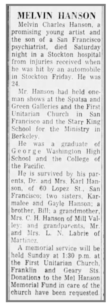 “Melvin Charles Hanson ’60 died in a Stockton hospital December 1 from injuries received when he was hit by an automobile the day before. The promising young artist, 24, had held one-man shows at the Spatsa and Green Galleries and the First Unitarian Church in San Francisco and the Starr King School for the Ministry in Berkeley. He is survived by his parents, Dr. and Mrs. Karl Hanson, San Francisco; two sisters, Karmalee and Gayle Hanson; and a brother, Bill. A Melvin Hanson Memorial Fund at the First Unitarian Church, Franklin and Geary Streets, San Francisco, has been established.”