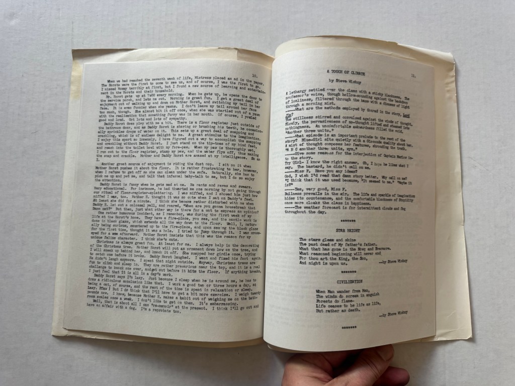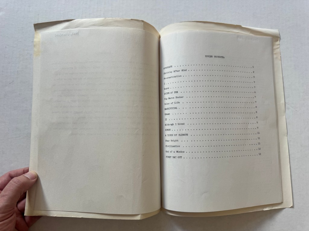 The preface explained the purpose of the magazine: “It is designed to bring original literature to the COP campus without being a function of the college or just another activity for the contributors. The first glimmerings of Uffish Thought came when a group of students were discussing some of the things which they had written and thought (somewhat uffishly) that it might not be a bad idea if more people were exposed.”