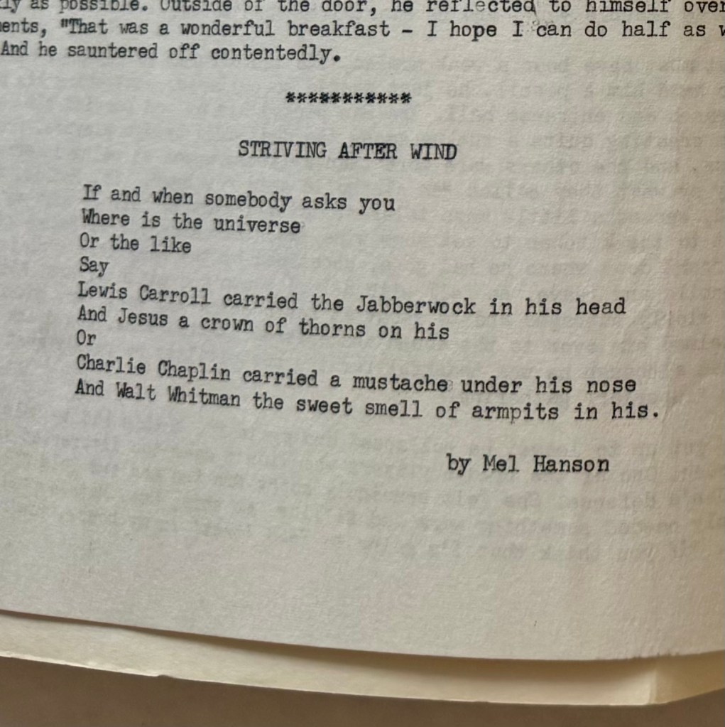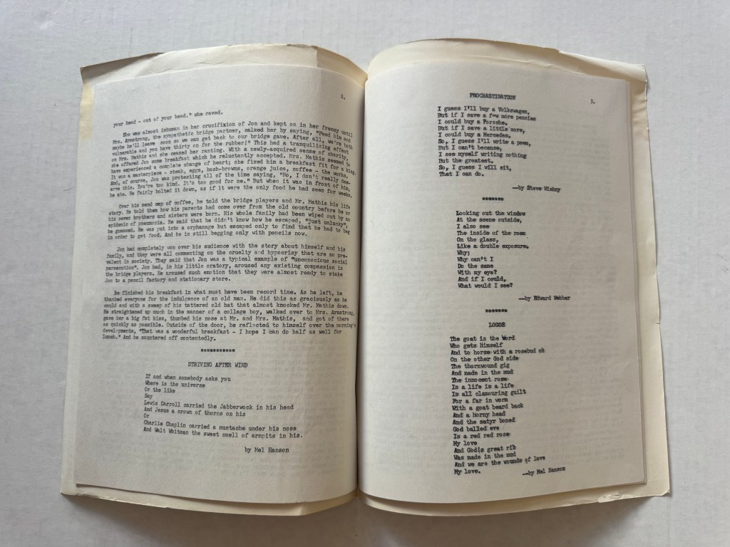 In addition to two poems, “Striving After Wind” and “Logos,” Hanson contributed the artwork for the cover.