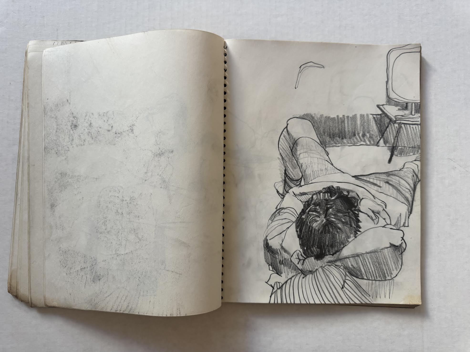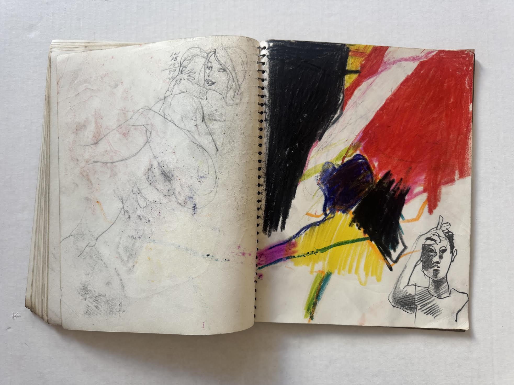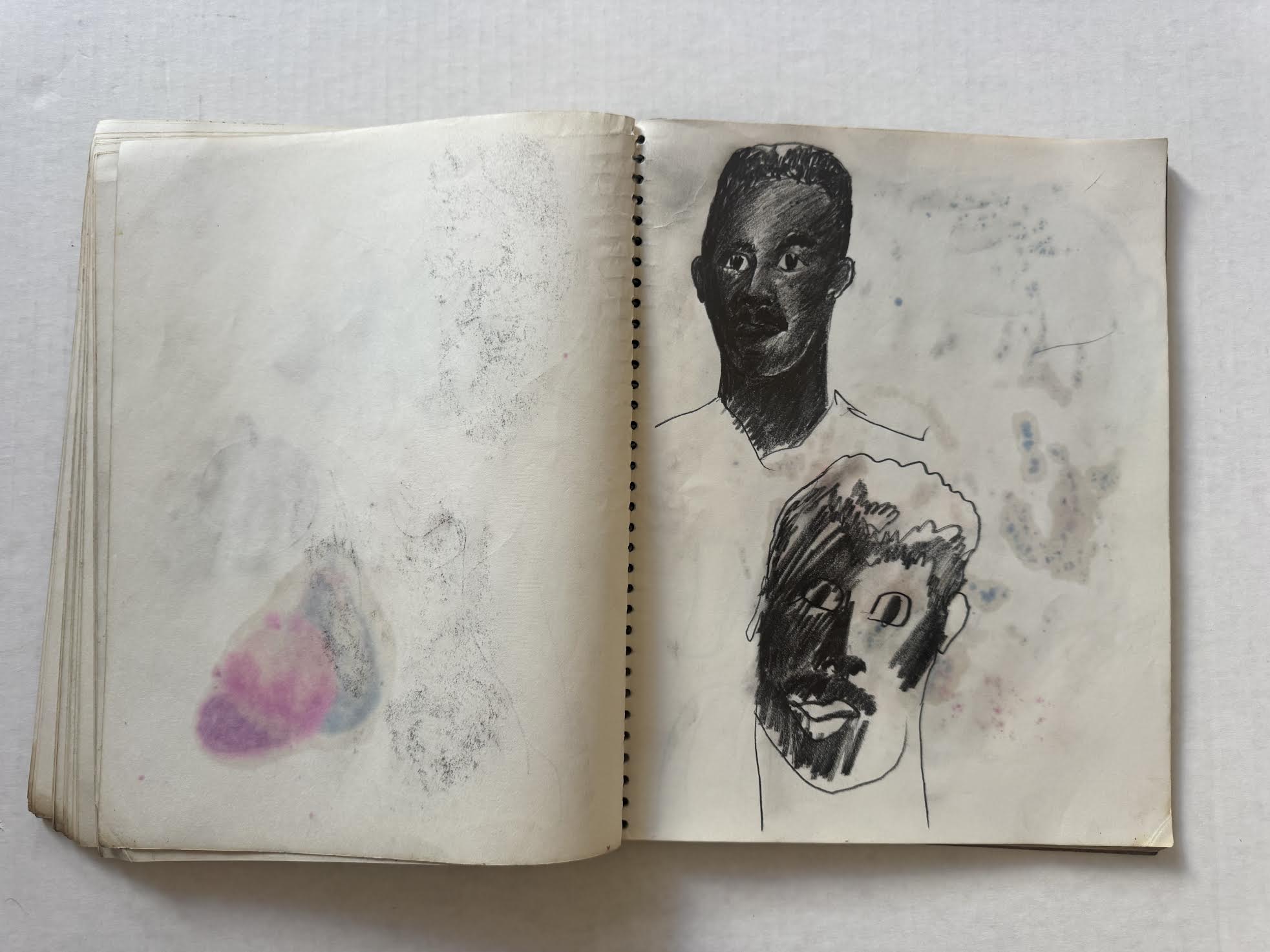 David Keaton, an art dealer based in Sonoma, California, who has also curated many exhibitions of post-World War II artists, first identified the notebook that came from Mel Hanson’s estate (via his father Dr. Karl Hanson to art dealer David Carlson in the late 1990s) as possibly belonging to Firehaus member Jim Muhs. The notebook is filled with artwork that does not appear to be by Hanson, yet still matches the general representational aesthetic of the period.