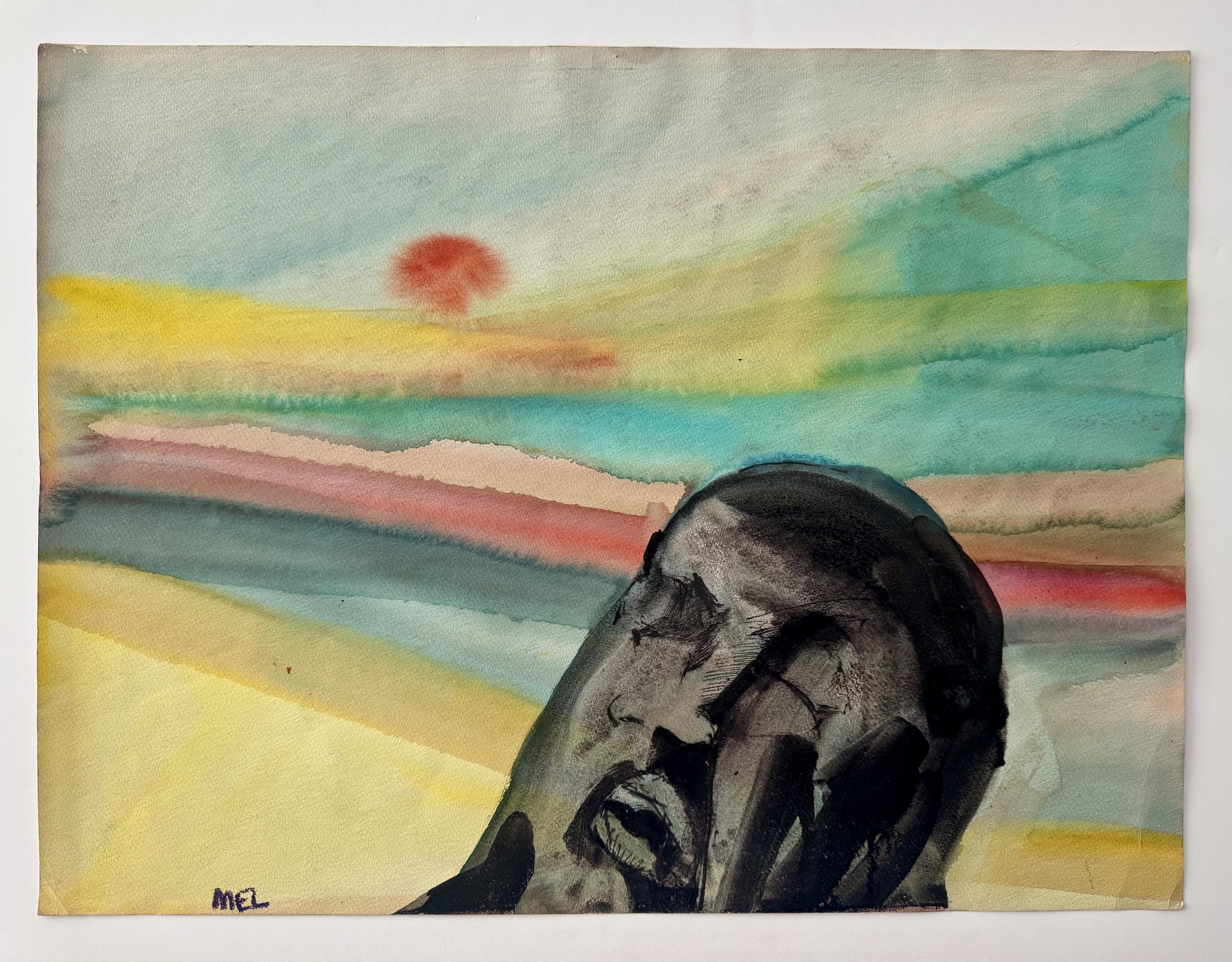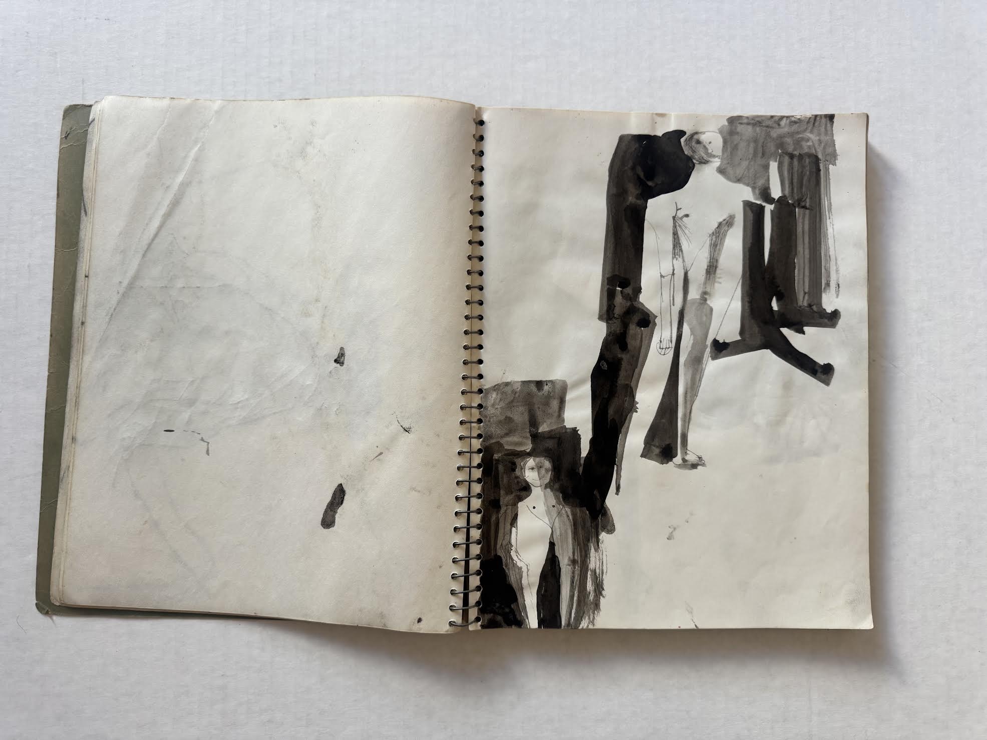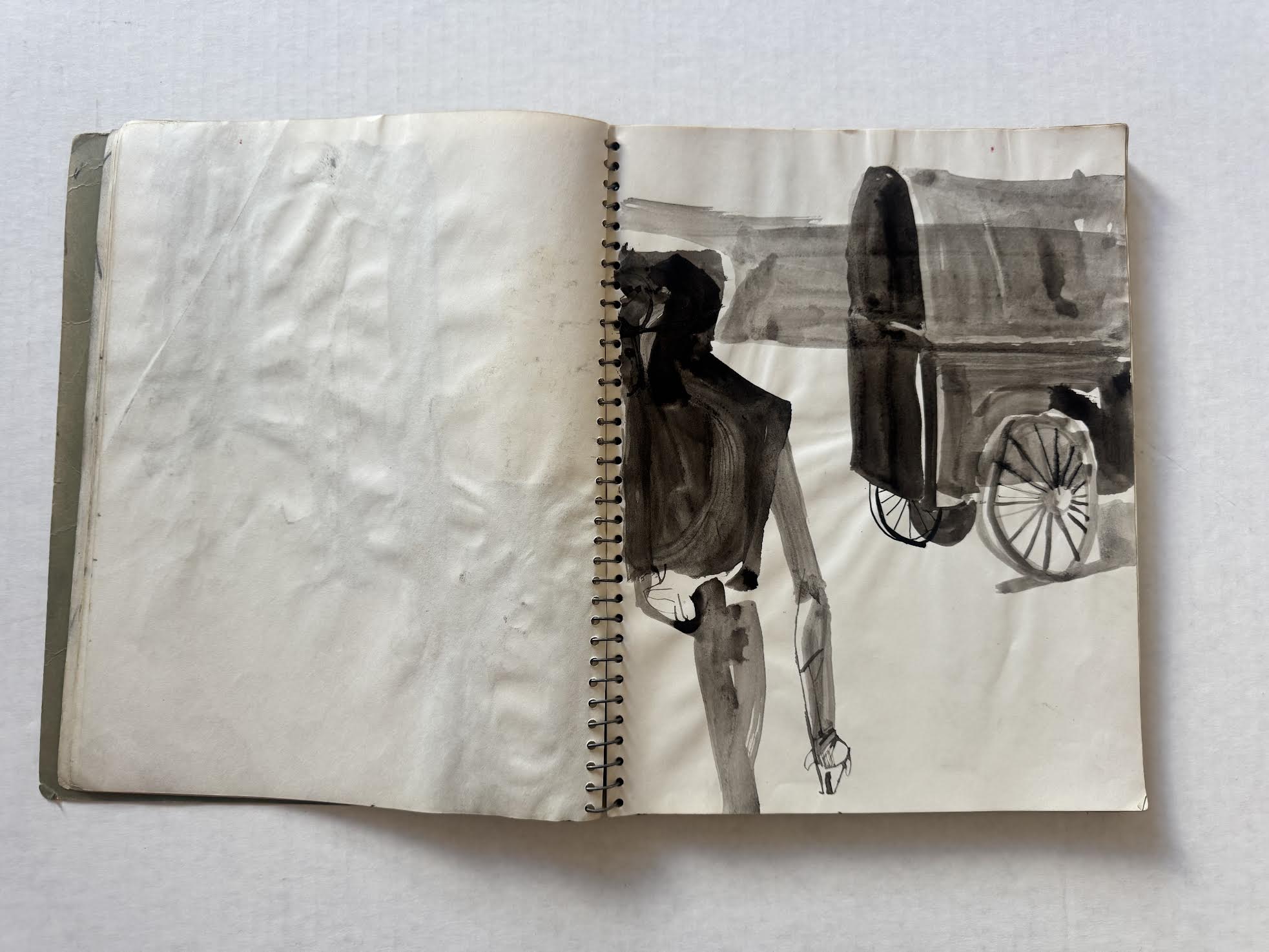 David Keaton, an art dealer based in Sonoma, California, who has also curated many exhibitions of post-World War II artists, first identified the notebook that came from Mel Hanson’s estate (via his father Dr. Karl Hanson to art dealer David Carlson in the late 1990s) as possibly belonging to Firehaus member Jim Muhs. The notebook is filled with artwork that does not appear to be by Hanson, yet still matches the general representational aesthetic of the period.