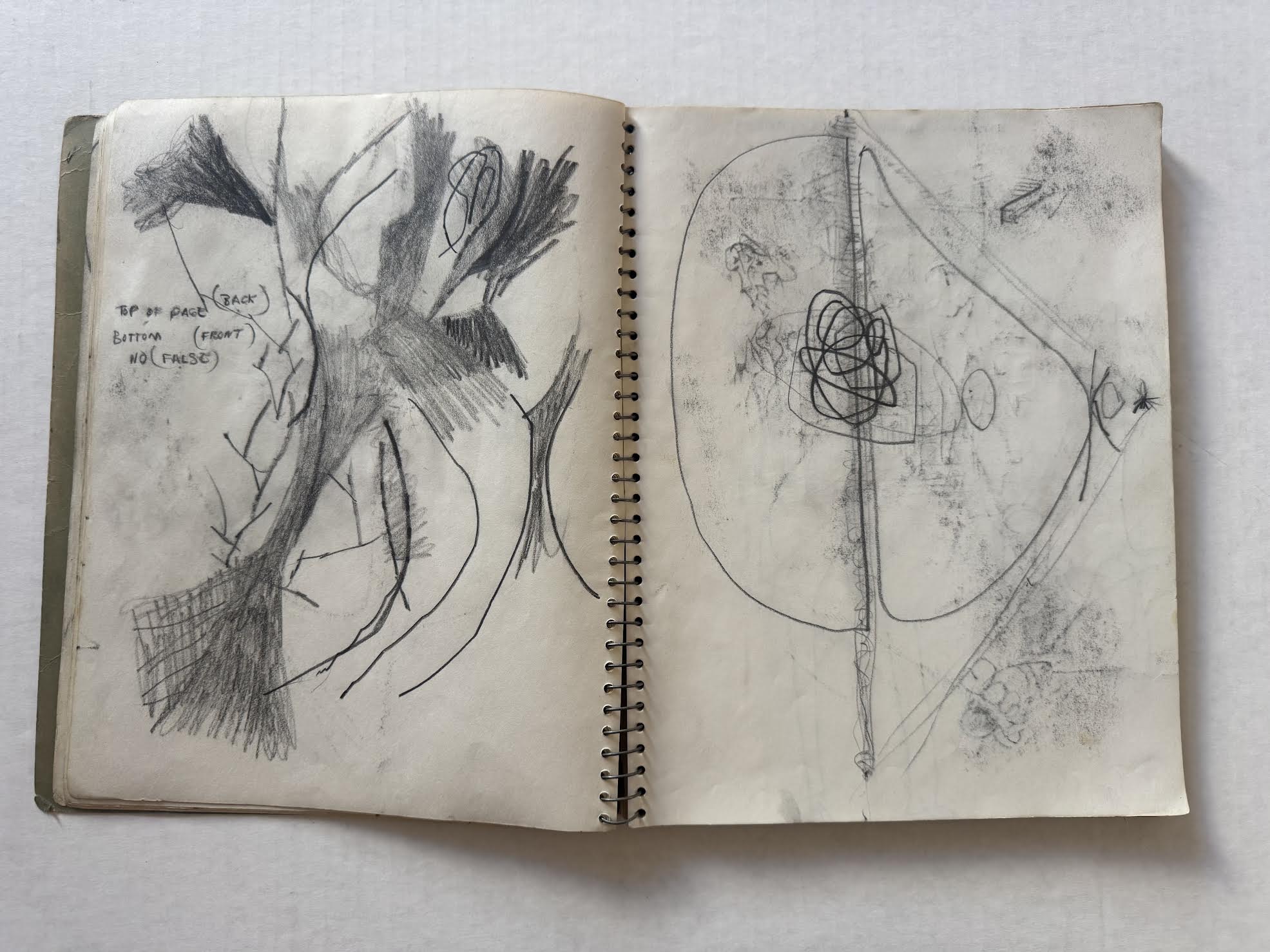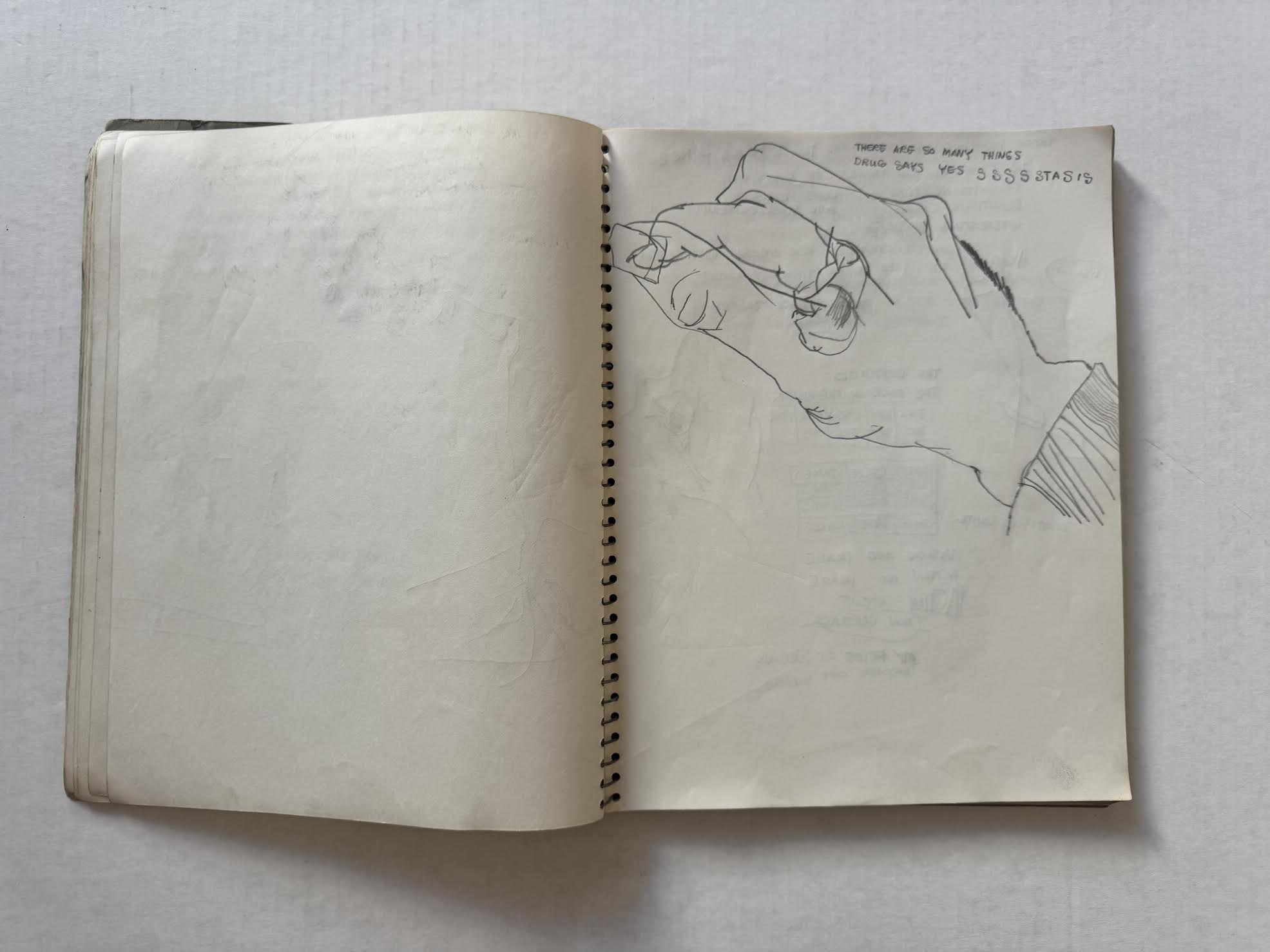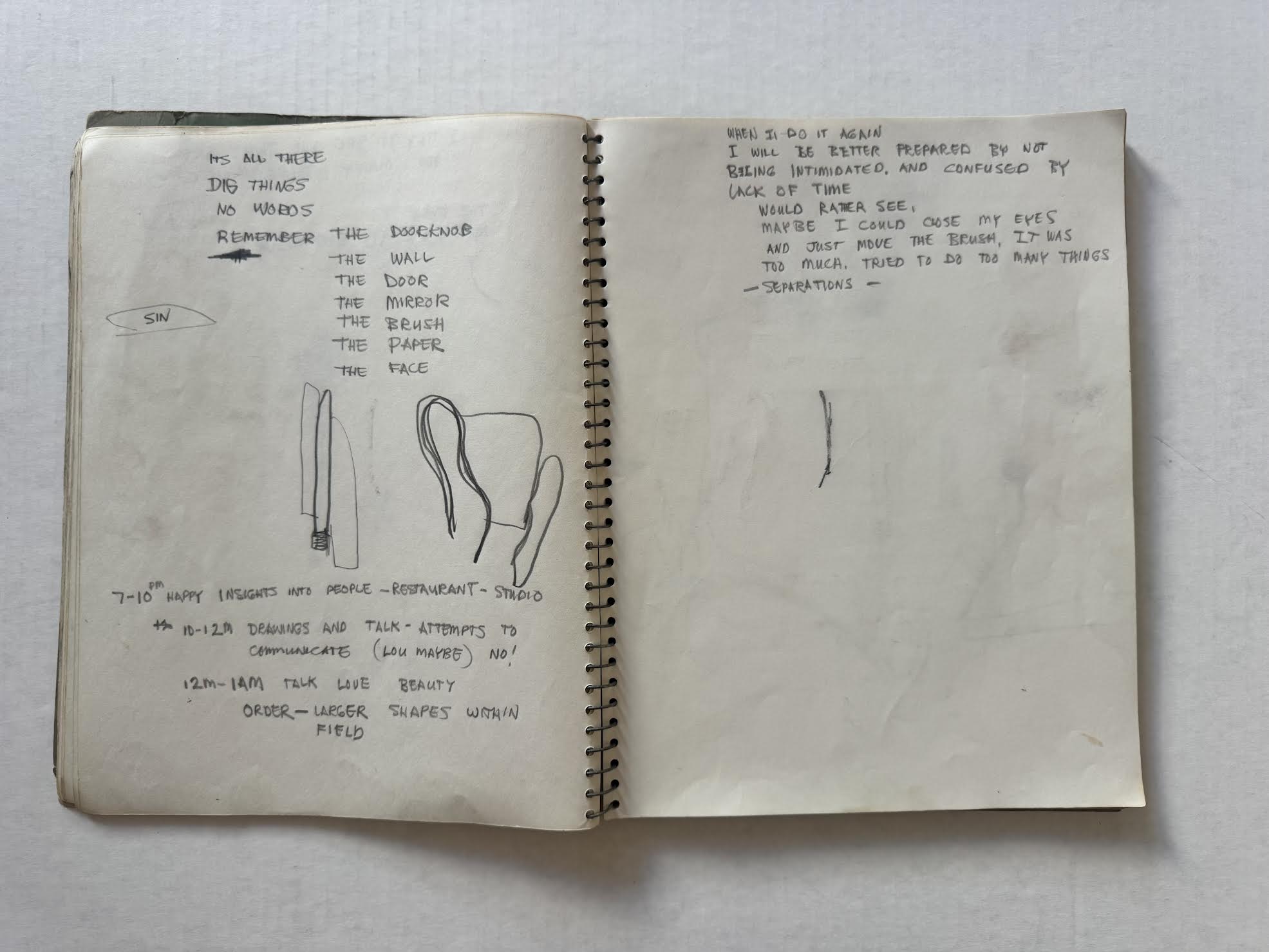 One way to align Muhs’ presence in different places, at or around the same time, is to surmise that he traveled back and forth from Los Angeles to Stockton and attended school intermittently, until he ultimately relocated back to Los Angeles. The notebook could be the product of activity from both geographic areas. Otis notes that Muhs completed his M.F.A. in 1960 but there is no indication when exactly he chose to stay in Southern California. That the notebook was found among Mel Hanson’s belongings in Stockton is the strongest indication it is a Firehaus relic. It is possible that Muhs forgot or abandoned the notebook in Stockton when he permanently returned to Los Angeles, or that it was gifted or traded with Mel Hanson for something, and thus, was later found among the personal belongings of Hanson, which the family picked up after his death in late 1962.