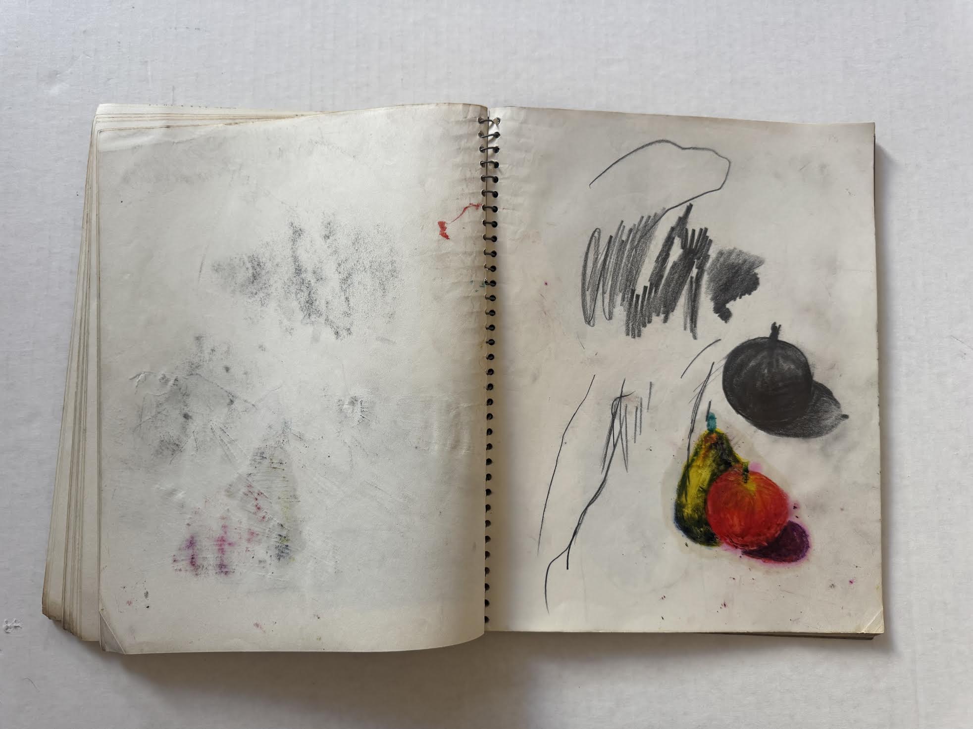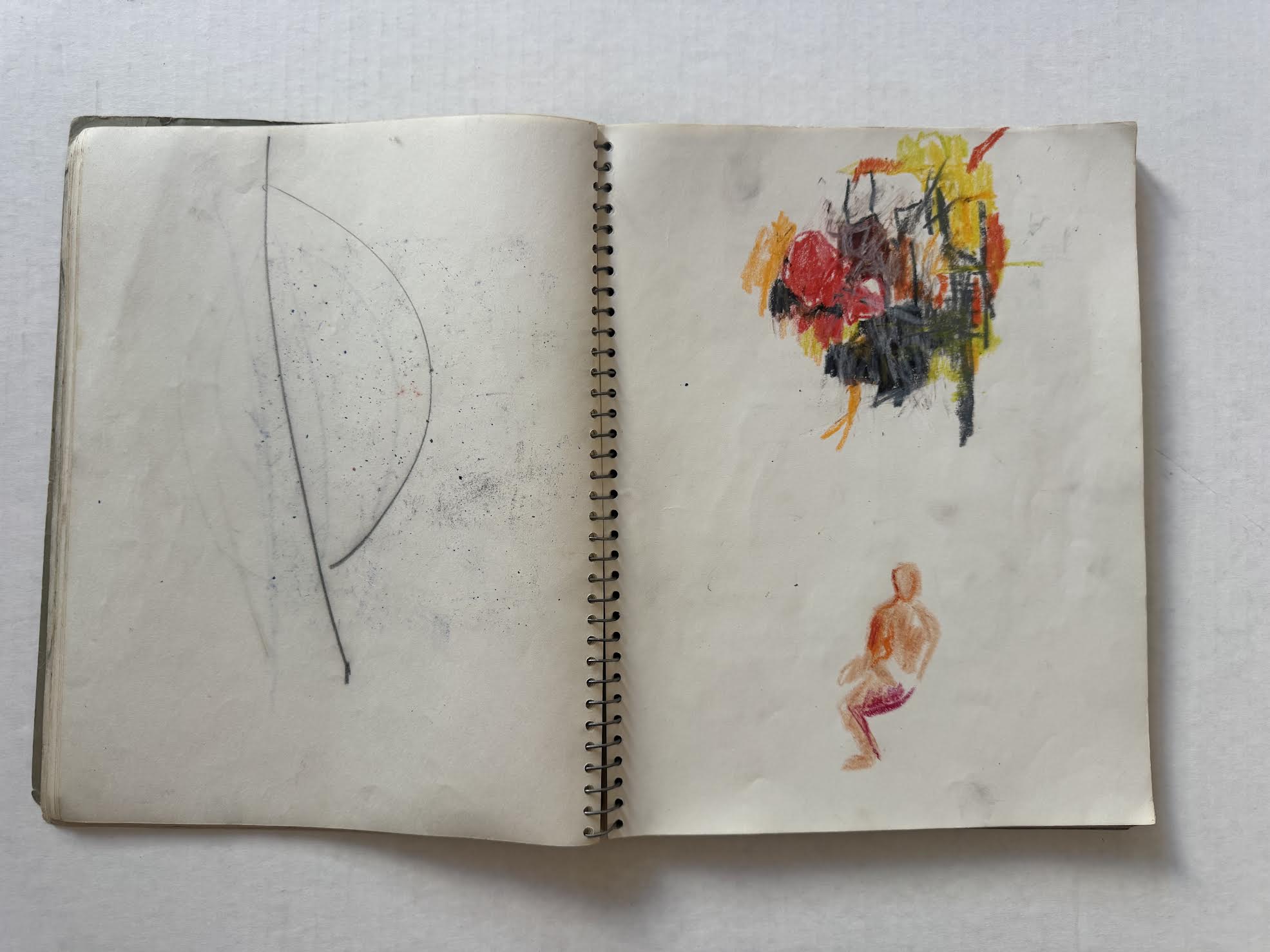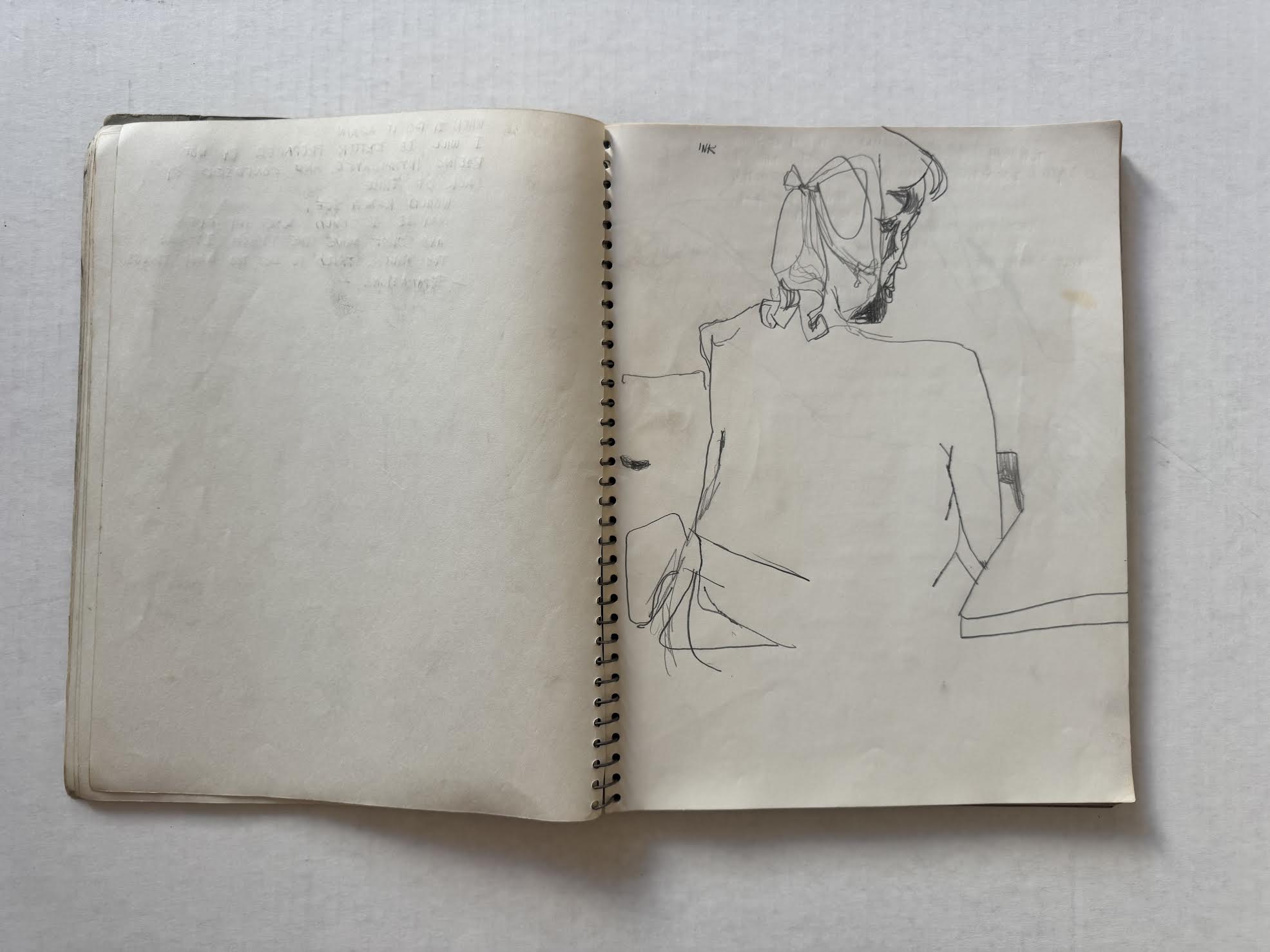 One way to align Muhs’ presence in different places, at or around the same time, is to surmise that he traveled back and forth from Los Angeles to Stockton and attended school intermittently, until he ultimately relocated back to Los Angeles. The notebook could be the product of activity from both geographic areas. Otis notes that Muhs completed his M.F.A. in 1960 but there is no indication when exactly he chose to stay in Southern California. That the notebook was found among Mel Hanson’s belongings in Stockton is the strongest indication it is a Firehaus relic. It is possible that Muhs forgot or abandoned the notebook in Stockton when he permanently returned to Los Angeles, or that it was gifted or traded with Mel Hanson for something, and thus, was later found among the personal belongings of Hanson, which the family picked up after his death in late 1962.