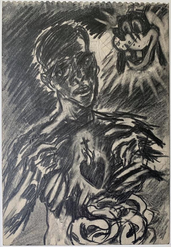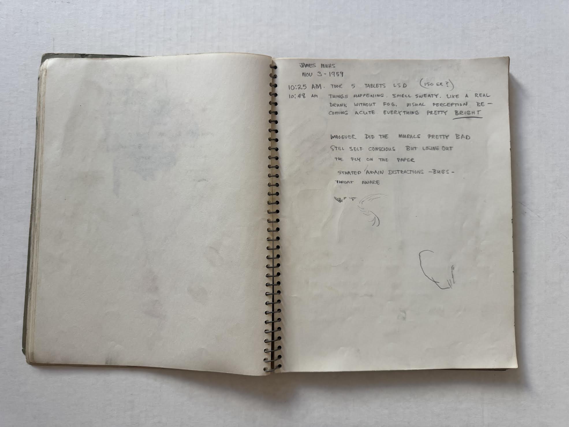 A recently discovered notebook by Jim Muhs, dated 1959, found among the artworks and ephemera that came from Mel Hanson’s estate, provides a fascinating window into the Firehaus days. Although the notebook lacks the typical identifying information such as name and address on the inside cover of its pages, it does contain Jim Muh’s name in his handwriting (“James Muhs”) and a precise date (“November 3, 1959”), amidst the various pages filled with graphite and ink wash drawings. The printed name and date are part of the various entries Muhs made over a 15 hour LSD experiment.