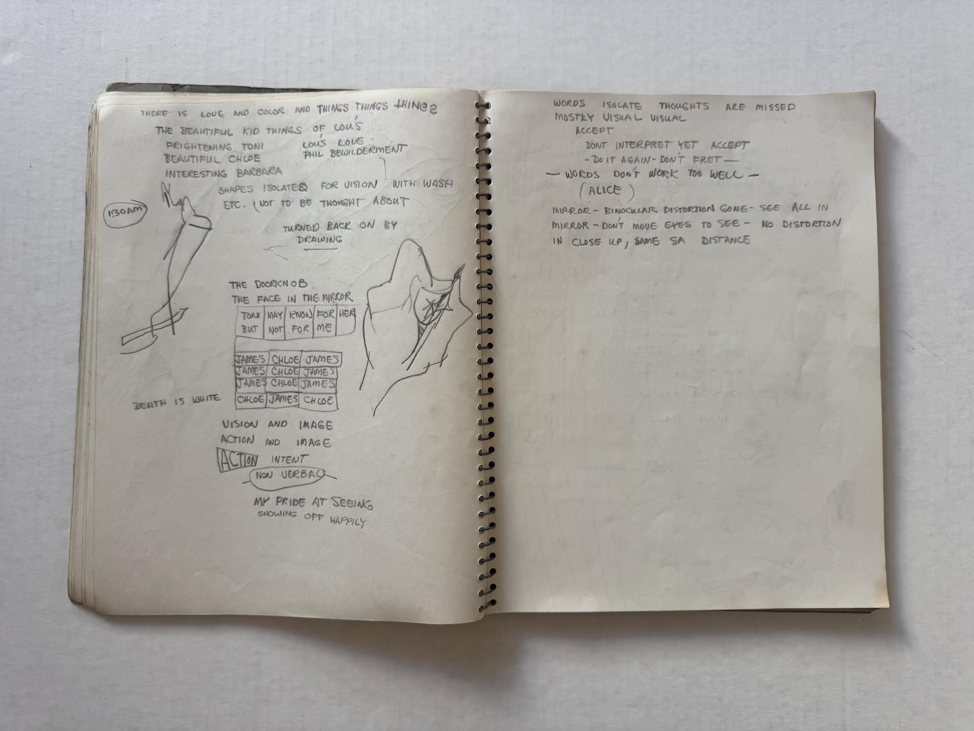 Relevant pages from Jim Muhs’ late 1950s notebook which includes notes during an LSD experiment. Private collection, Southern California.
