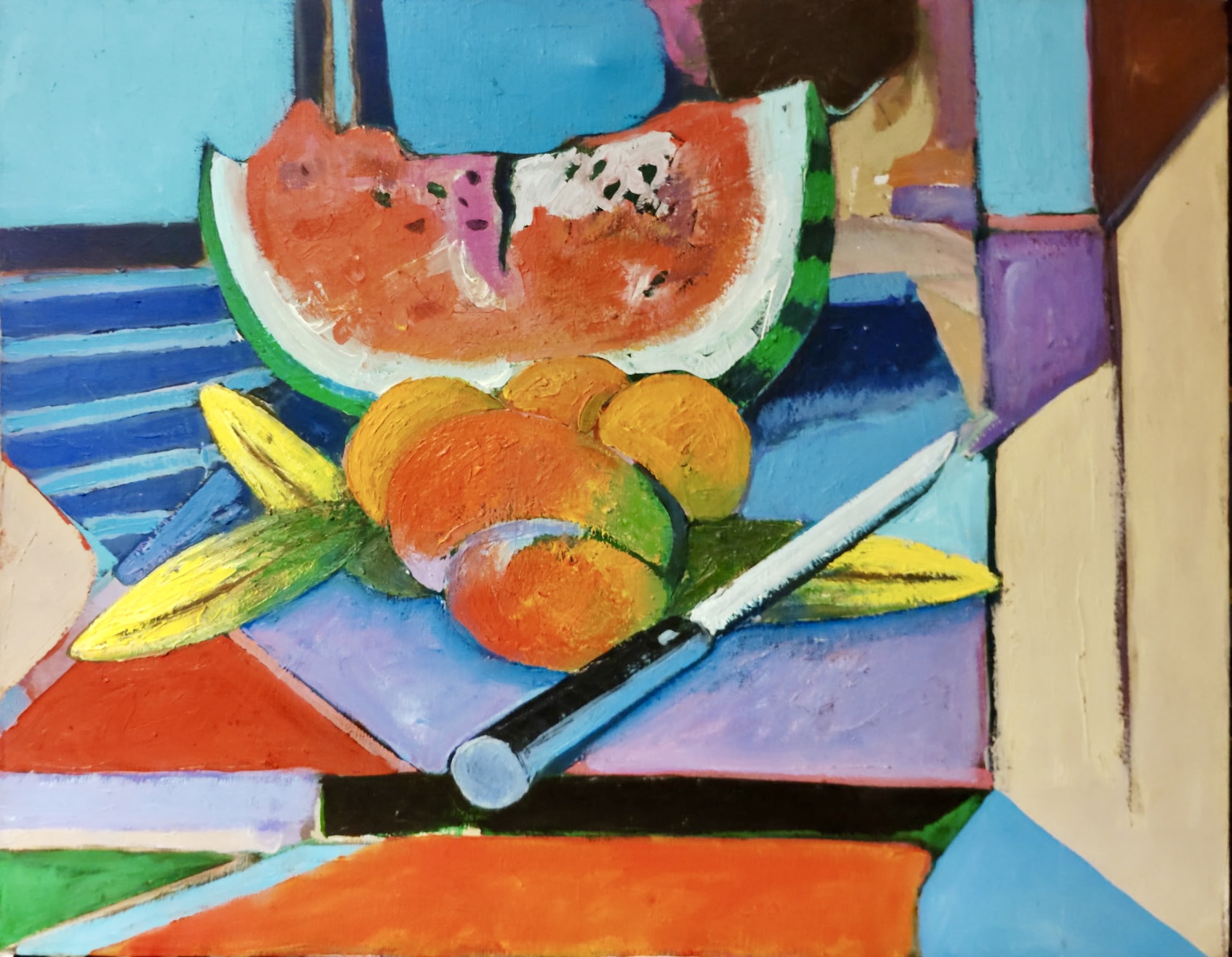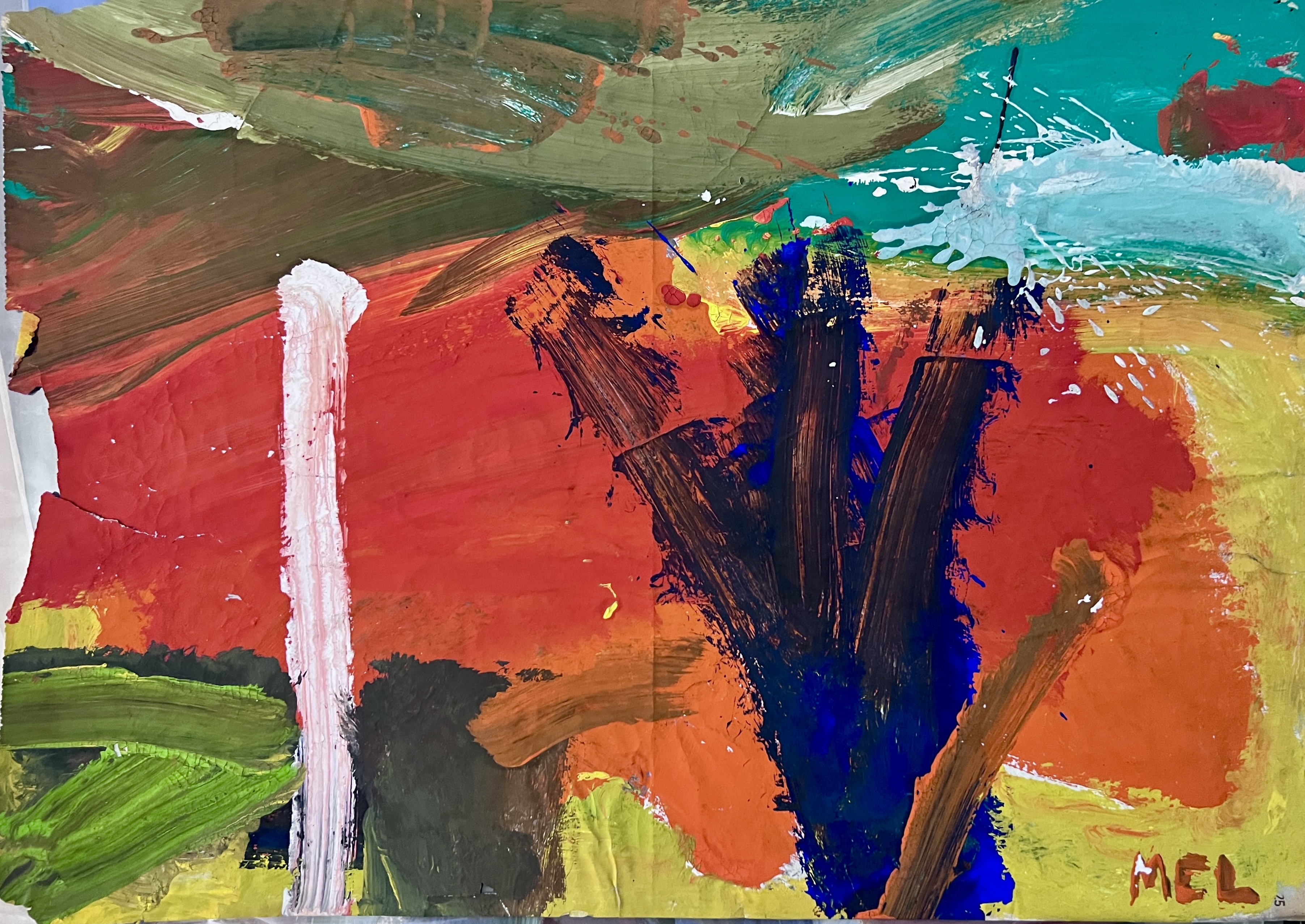 “The materials for most of us included Fuller Color in Oil. It came in quarts and gallons and was normally used to tint house paints, as they were pure color. They were very inexpensive, five dollars for a gallon of red. House painters’ brushes helped to cover canvases rapidly and large tubes of oil paint with artist bristle brushes were used for the more detailed parts of the painting. Large sticks of charcoal, black inks, colored pencils, carpenters pencils, large spatulas, and other materials and implements if needed were also employed.”