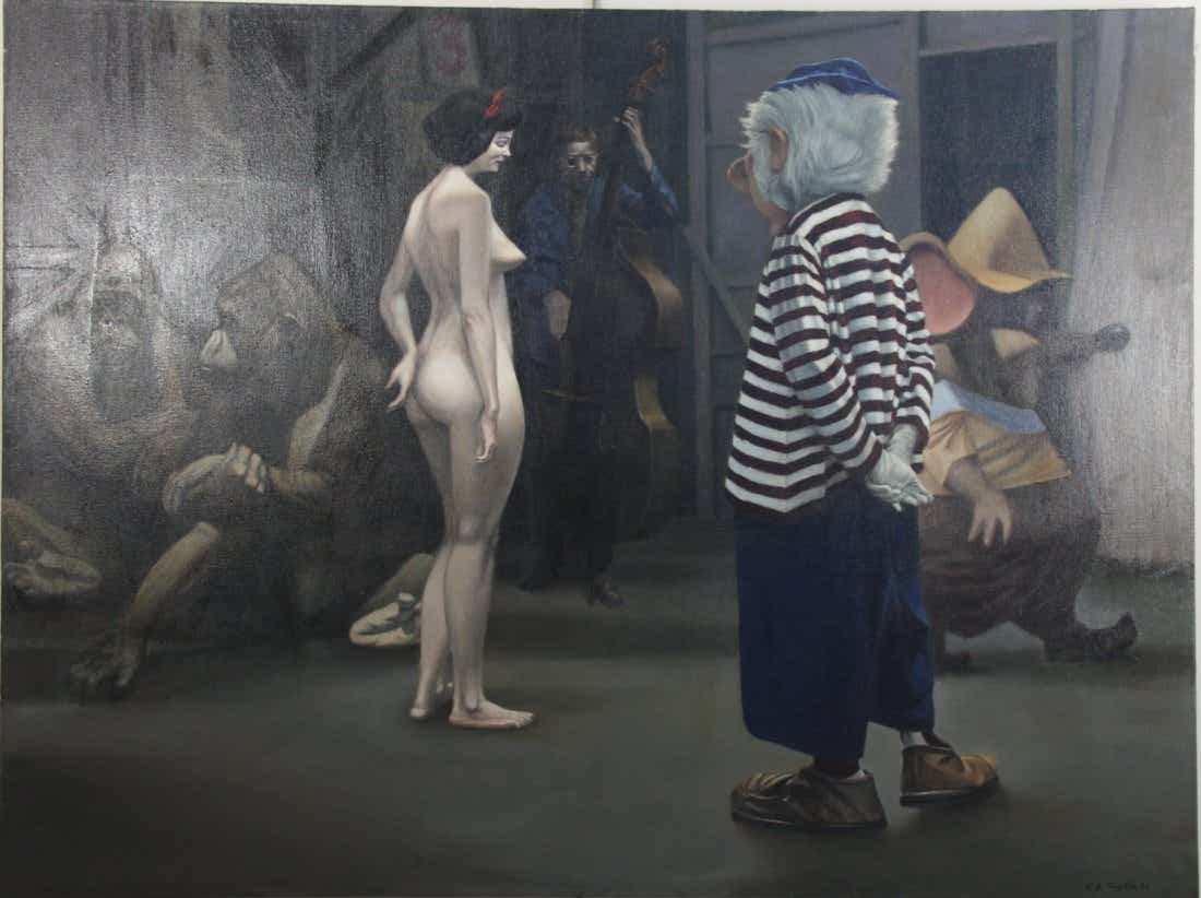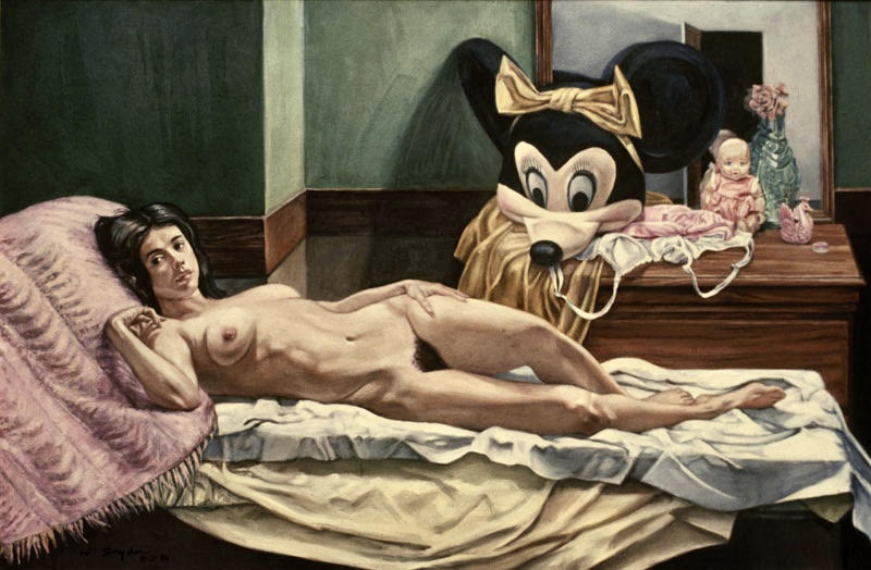 “Hanson’s portraits and cartoon studies, while often whimsical, also mask darker social commentary and astute political observations. Images of death seem almost prophetically to be lurking about his self-portraits, and his use of Disney characters, particularly his obsession with Donald Duck, are both violent and ominous. One of his seminal works “The Temptation of St. Walt Disney,” captures his ambivalence toward the cartoon patriarch and the grotesque social fantasies behind his characters’ violent and anarchistic behavior. The beloved Disney icons are portrayed as dark shadows posed in threatening and openly hostile behavior toward their imperiled creator.
