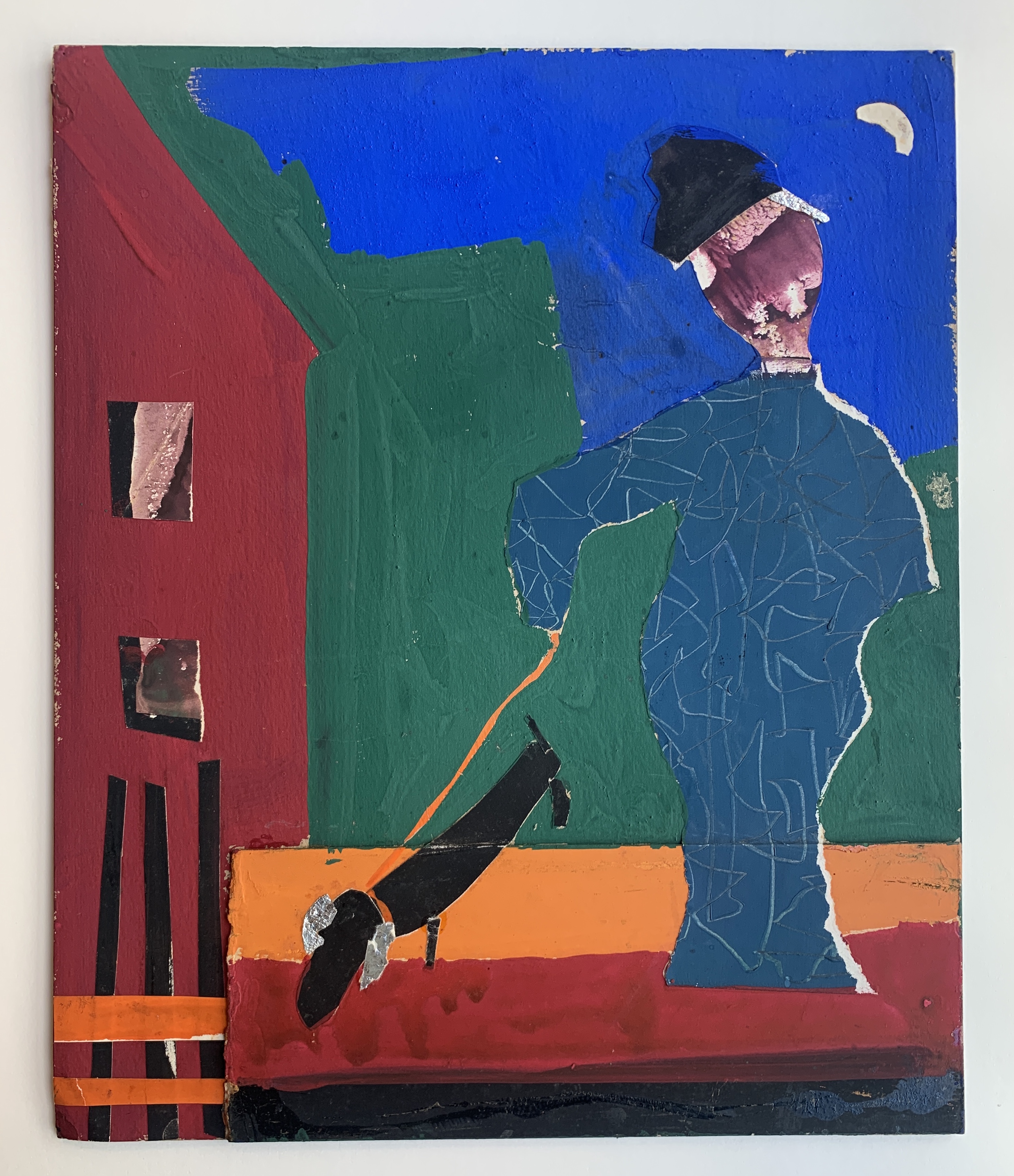 Cedric Wentworth: “Hanson’s interest in Pop Art can be seen in a dramatic self-portrait fabric collage made the year before his death. Self Portrait With Frankie Dewey’s Red Wig shows the artist smoking a cigarette and wearing a broad brimmed floppy felt hat. A bright red wig frames his sunglasses. The artist stares straight at us, the bony forms of his face giving him a frightening, otherworldly presence. The portrait is disconcerting, even menacing, as a sense of foreboding permeates the image.” Rubber Diamond Gallery.