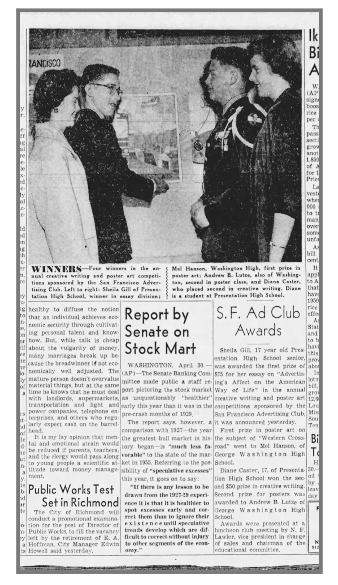 Biographical information about Mel Hanson is scarce. He graduated from George Washington High School, a public school in the Richmond District of San Francisco, in the Spring of 1955. His graduation yearbook professes his interest in painting, coins, and stamps.[fn23] Just prior to graduating, Hanson won a poster art competition hosted by the San Francisco Advertising Club. First prize was $75.00.