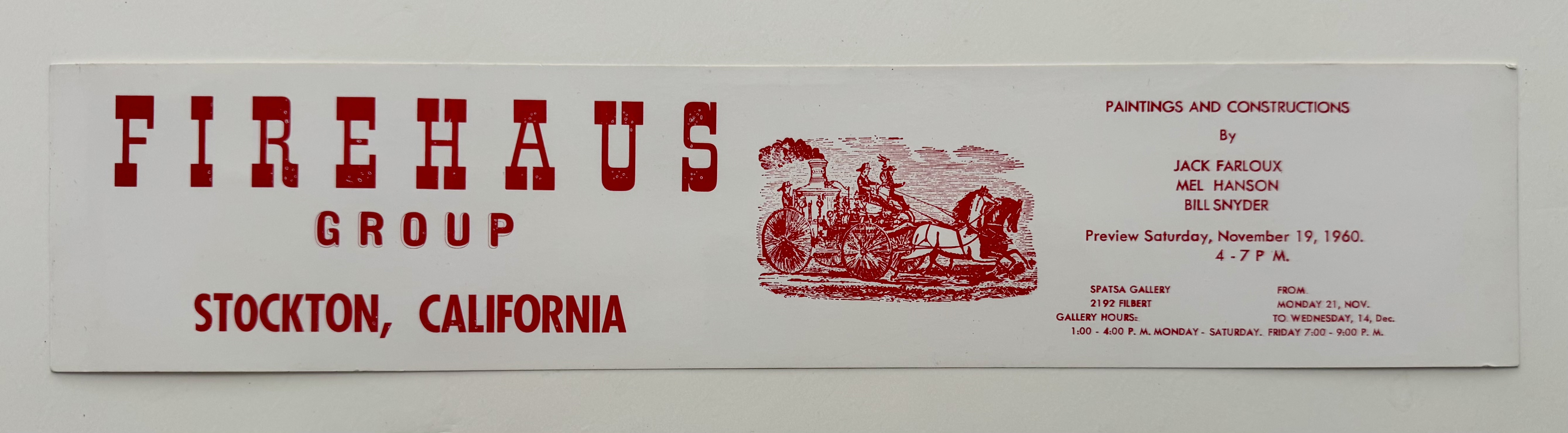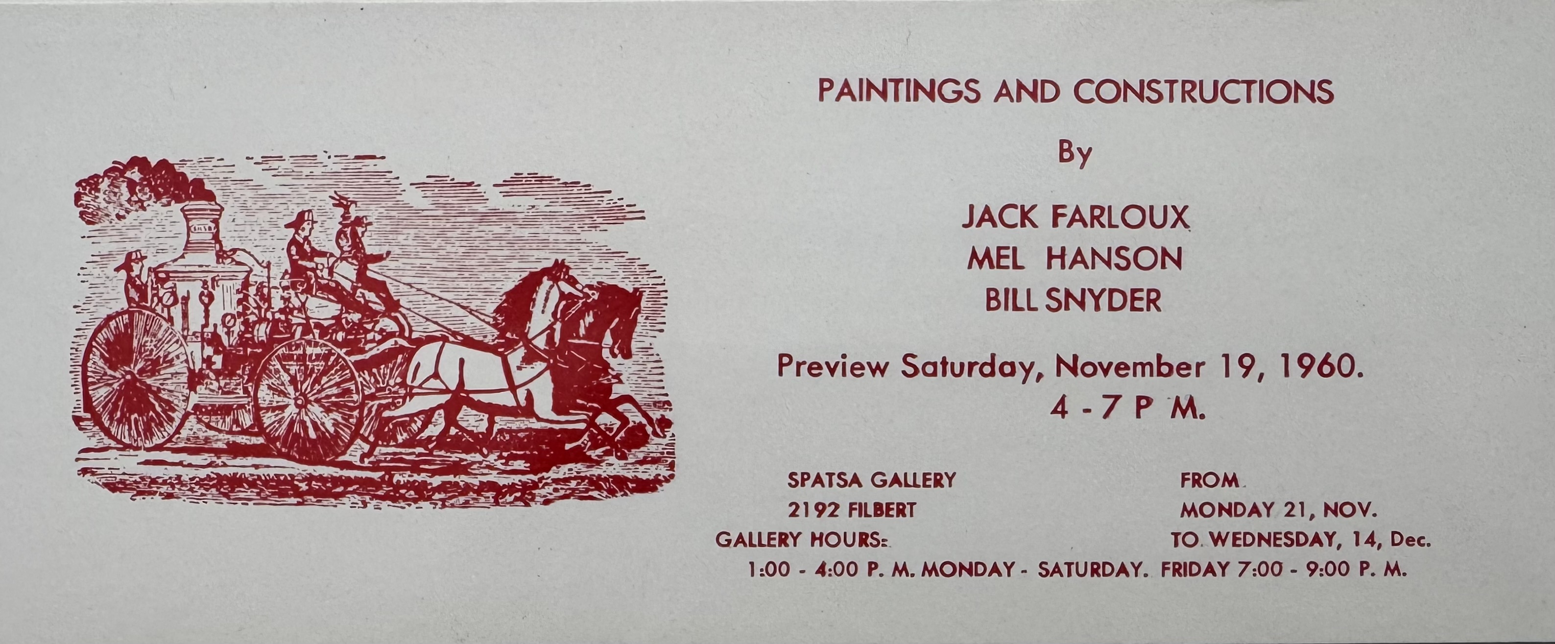 On November 19, 1960, Jack Farloux (a pseudonym Farley used), Mel Hanson, and Bill Snyder made their San Francisco debut at the Spatsa Gallery on Filbert Street, in a show that included “Paintings and Constructions.” The three painters identified themselves as the “Firehaus Group” from Stockton, California. Snyder recalled that Muhs and St. John were not included because they had just graduated and didn’t have enough work to exhibit. Snyder observed “We were all painting large-format paintings then but we managed to get a fairly representative collection of our work together, anyway.”
