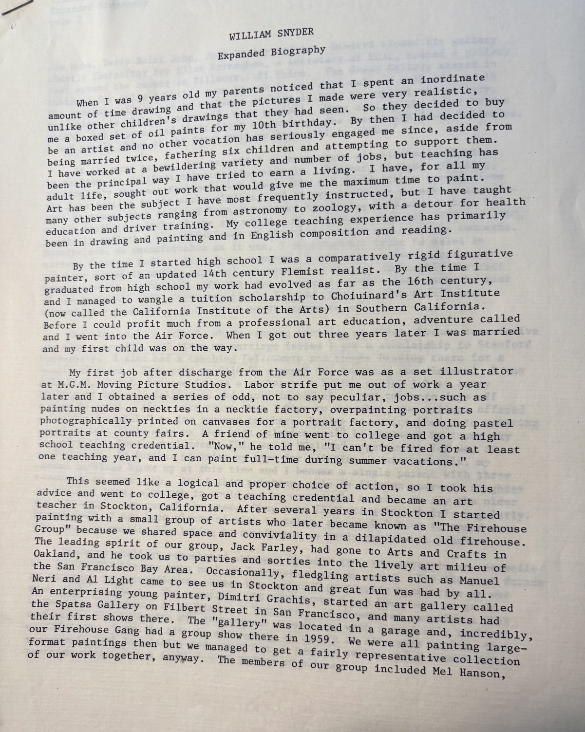 In contrast to Farley’s recollections, St. John stands by his inclusion of Rodriguez, “Peter was proud to be in the group.” Notably, in a 1991 exhibition catalog of landscape paintings at the Contemporary Realist Gallery in San Francisco, the biographical note for St. John states: “In the early 1960s, St. John worked with Stockton painters Bill Snyder, Mel Hansen [sic], Jack Farley and Peter Rodriguez, who called themselves the Firehouse Group.” [fn7] This information, likely obtained from St. John, at least suggests that his inclusion of Rodriguez in the group is not a recent memory.