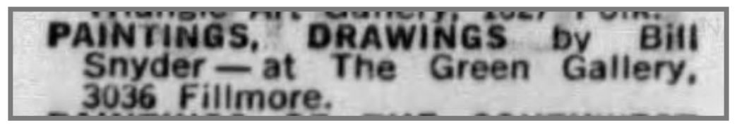 Farley recalls that the Green Gallery exhibition took place “a couple of years after the Spatsa show” and only included Mel Hanson and himself, but records of exhibitions at the Green Gallery are not readily available to confirm these recollections.[fn21] It is believed that Bill Snyder also went on to show at the new gallery, between 1961-66. One solo exhibition featuring Snyder in 1962, during the Firehaus days, has been confirmed by a notice in the San Francisco Examiner, November 25, 1962.