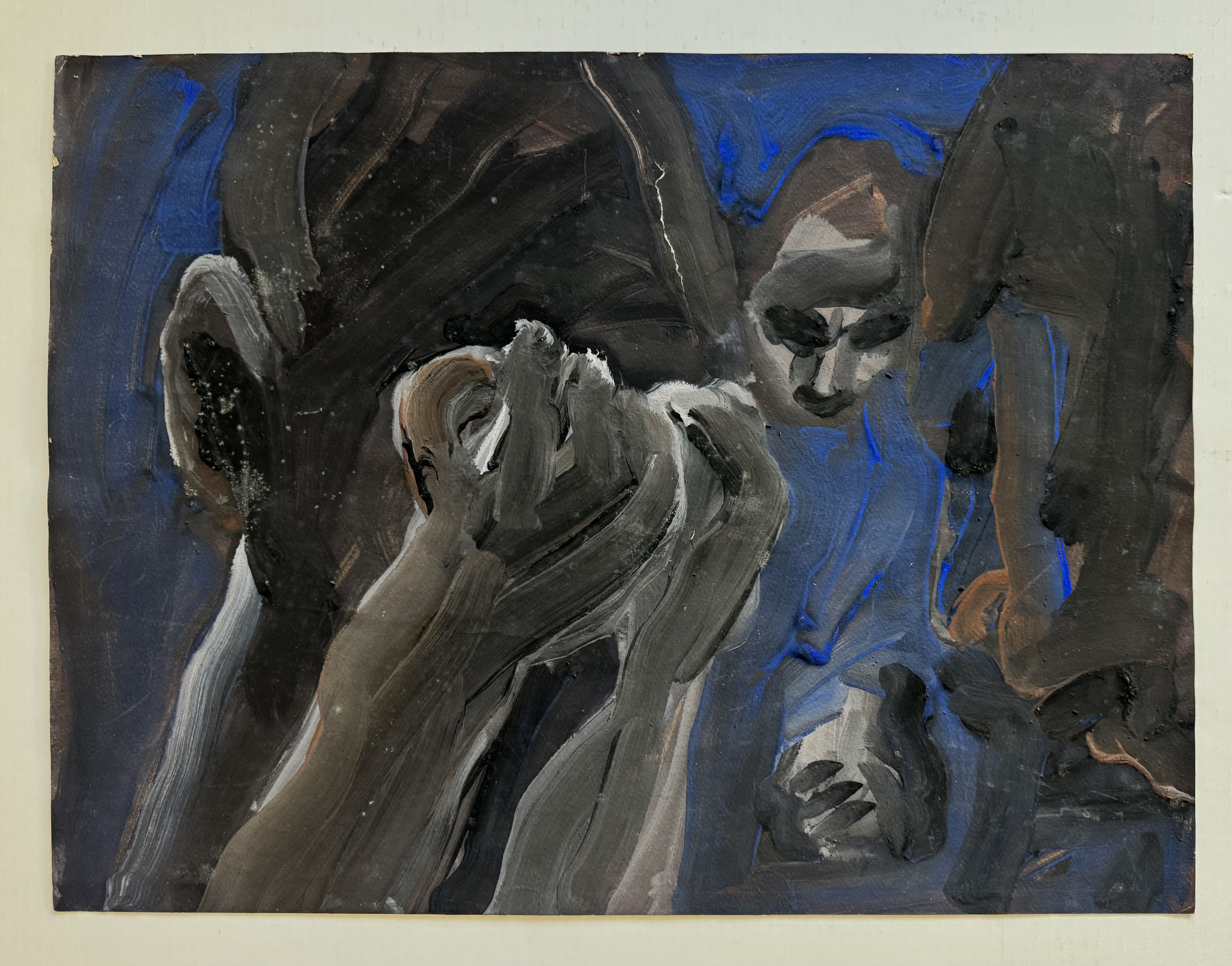 Two early watercolor or gouache paintings made by Hanson, including one dated 1953 when he was 15 years old (possibly depicting jazz trumpeter Louis Armstrong & his band and the second portraying Henri de Toulouse-Lautrec at the Moulin Rouge cabaret). Collection of Shirley Austin, Glen Ellen, CA.