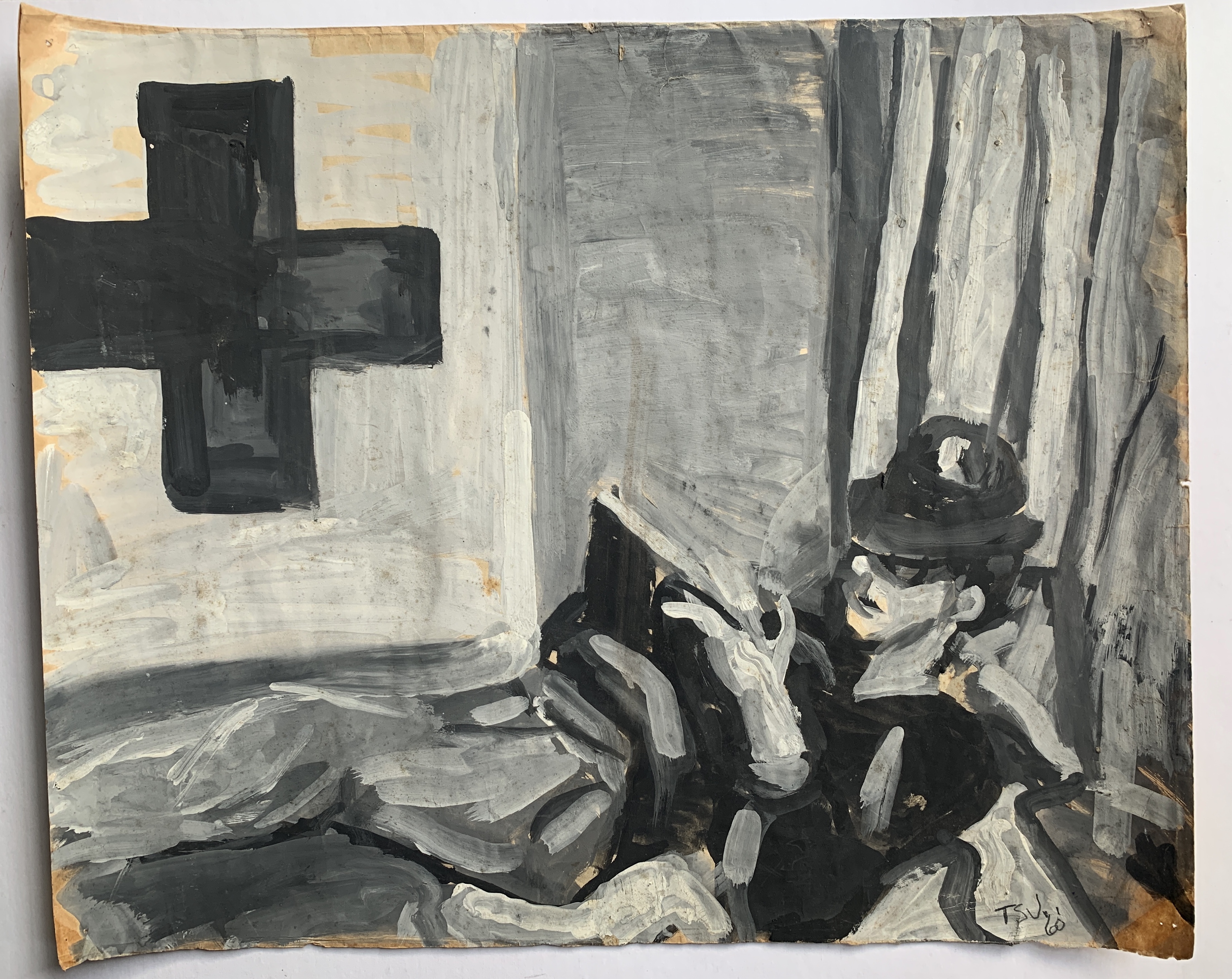 35 — There are many other stories of the Firehaus Group. In one, St. John remembers that some members of the Firehaus group served as extras in a local play, or what St. John calls “walk on actors.” The play was performed at College of the Pacific or a Jr. College in the area and St. John recalls it was “possibly by Brecht”. With the passage of nearly 60 years it’s difficult to recall details, but St. John remembers that it was a “legitimate theater, a nice stage, before a large audience”. He specifically recalls the play was “definitely German Expressionist” and that “I recall a burial scene” in it [making it possibly Bertolt Brecht’s Mother Courage and Her Children which includes a scene of Catholic General Tilly’s funeral]. St. John remembers that the director, Bill [last name unknown] was an English professor and actor, who later posed for St. John wearing a priest’s habit. St. John says “I have a tempera drawing of him much in the vein of the drawing that I made of Mel.”