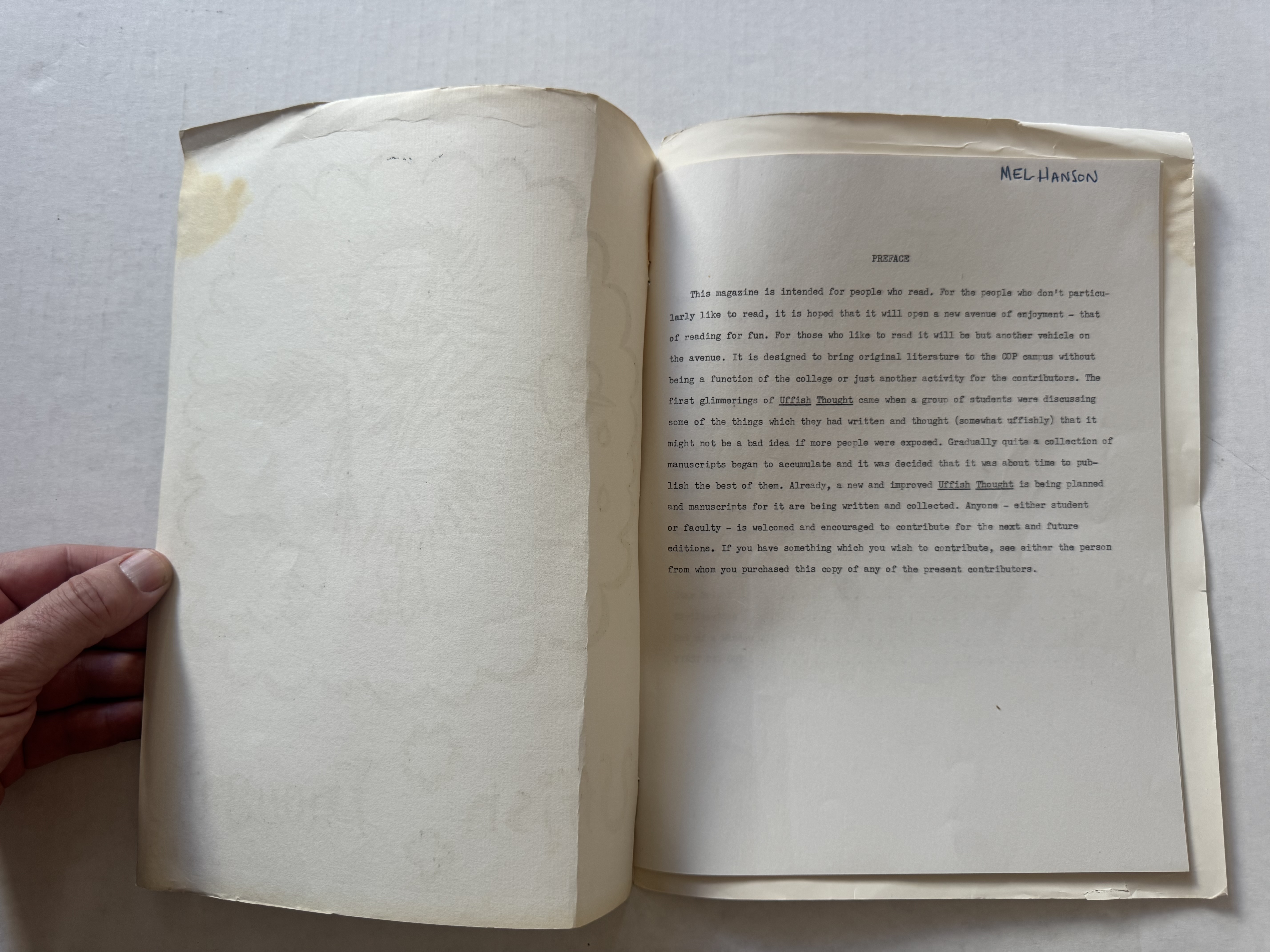 The preface explained the purpose of the magazine: “It is designed to bring original literature to the COP campus without being a function of the college or just another activity for the contributors. The first glimmerings of Uffish Thought came when a group of students were discussing some of the things which they had written and thought (somewhat uffishly) that it might not be a bad idea if more people were exposed.”