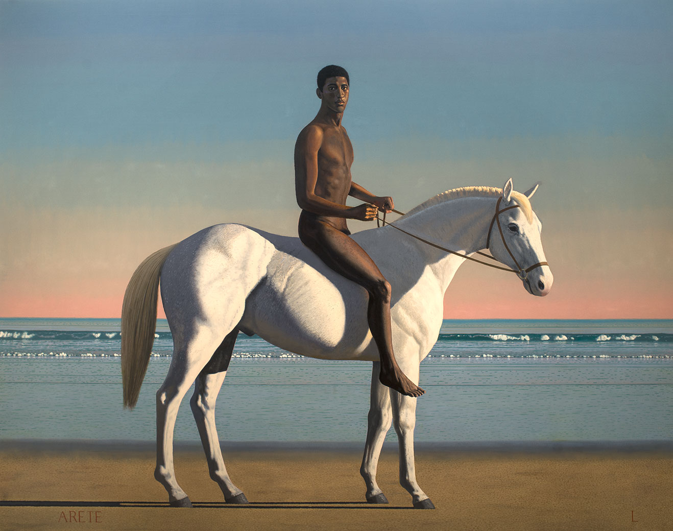 Ligare has cited the work of Elaine Scarry, “On Beauty and Being Just,” when discussing his work. She posits that beauty moves us toward a greater concern and understanding of fairness, in effect, that beauty is justice or a value that leans heavily toward it. Depictions of beauty in paintings and objects convey fairness and justice because of their impact on our sensory perceptions; we can feel their sense of completion and integrity. For Ligare, depictions of beauty visually challenge us to satisfy greater civic obligations and inspire personal growth, although this sentiment is not about arrogance or narcissism. Like his own brand of representation, it is not perfection that he is pursuing, but rather how the common person acquires exalted status as they play out their lives in dramas that will later be codified as myths. Here, Ligare is telling us this black man embodies excellence (Arete); we merely need to confront our own biases; which curiously are conjured up the moment most of us see the markedly contrasted black man on a white horse. That we find the subject matter arresting or unexpected, itself raises issues of who we believe can attain Arete. A discerning viewer gazing upon this painting will contemplate what it is to be human and how ideas of excellence are realized regardless of culture and geographic boundaries.