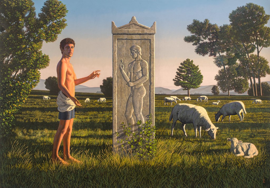 David Ligare, “Arcadian Shepherd, or, Et in Arcadia Ego” (“Even in Arcadia, there am I”), oil on canvas, 50 x 72 inches, 2021.