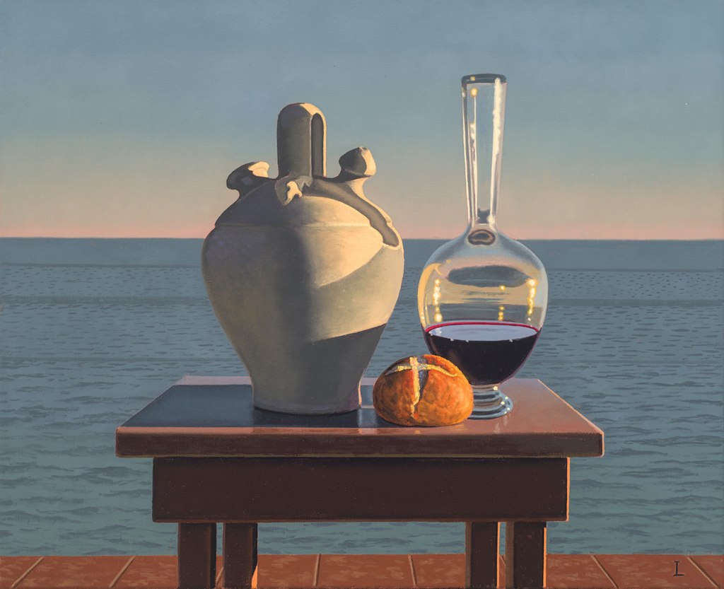David Ligare, “Still Life with Bread and Wine,” oil on canvas, 20 x 24 inches, 2021.